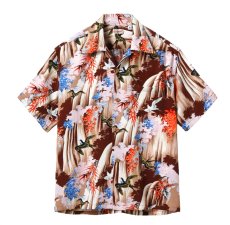 シャツ全体を絵のキャンバスに見立てて描かれているのは、大きな滝が流れ落ちる渓谷を飛び回る燕たち。色々な方向に勢いよく飛び交っている燕たちの躍動感、そして流れる水の清涼感までもが伝わってくる完成度の高い一枚。手がけたのはアリー・ディストリビューターズ社のブランド「キロハナ」。同ブランドは常に他のブランドには無い強い個性と美しい色使いを意識してデザインを製作し、地元ハワイの人々からも多大な支持を得ていた。
