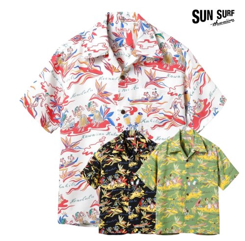 もし1950年代にこの和柄デザインが存在したのであればという仮説から、100%レーヨンちりめんでリプロダクトしたモデルがAL-17です。縦糸に強撚フィラメントレーヨンを張り、横糸にはS(右)撚2本、Z(左)撚2本を交互に打ち込み、織り糸の組合せでちりめん形状を創るファブリックと、職人の手捺染プリント11色により創り上げた本物志向のハワイアンシャツです。現在この素材の貴重性も然ることながら、職人手捺染プリントの製造工程そのものが大変希少なものとなっています。