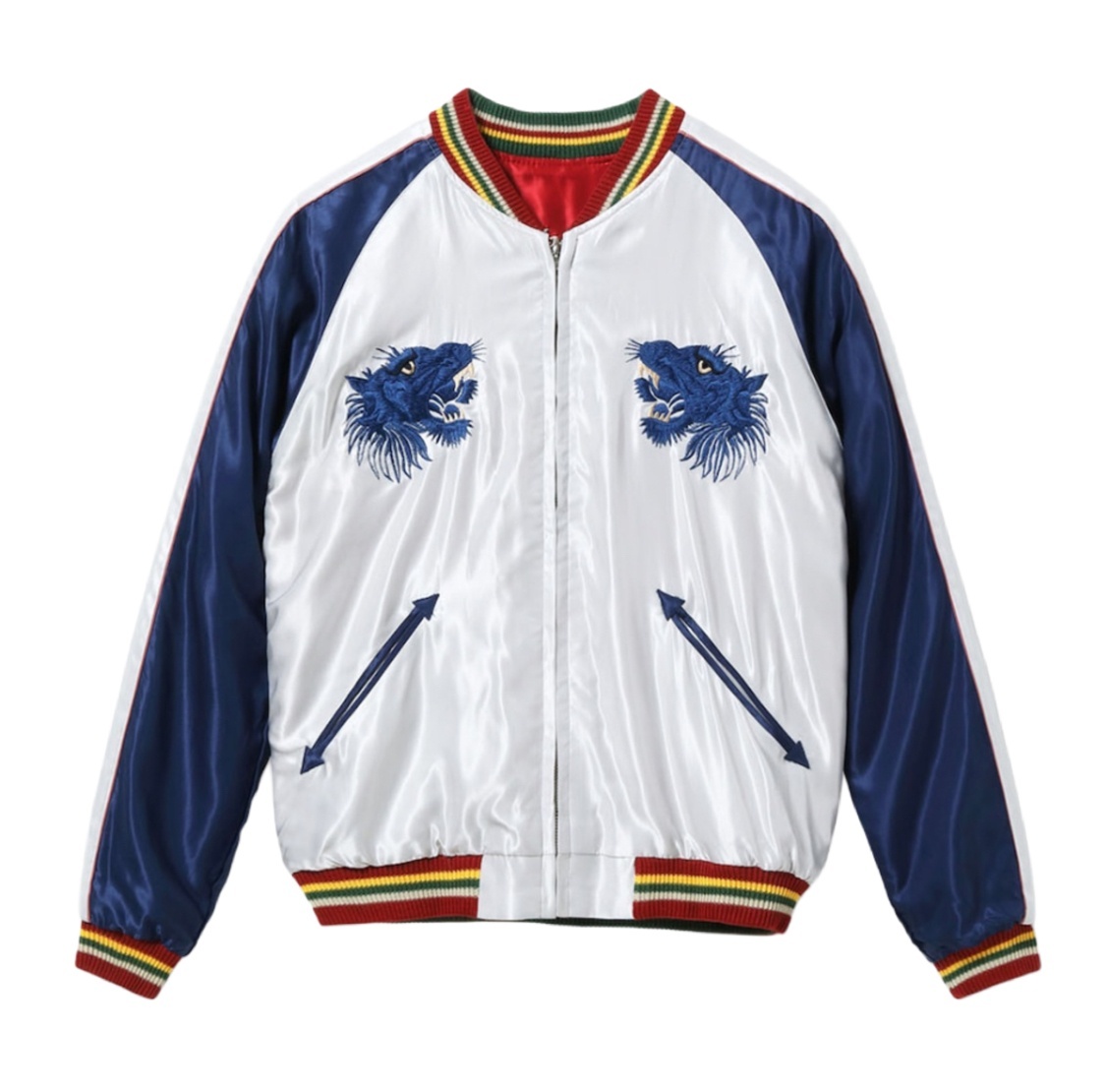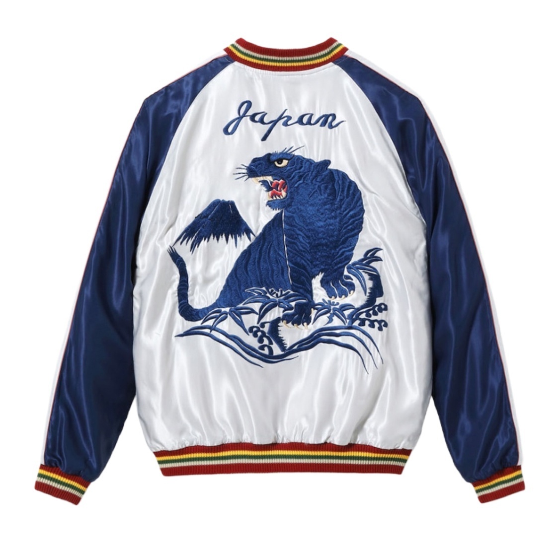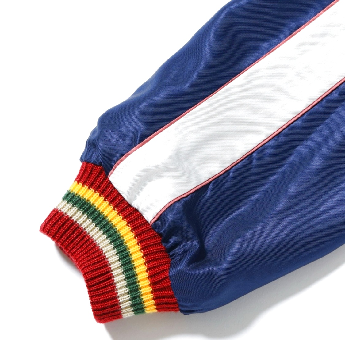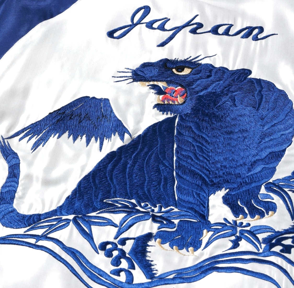 リバーシブル面は、身頃より袖下の色の方が濃いシルバー×ネイビーの「逆配色」ボディに、猛々しく吼えるブルータイガーが映える。光沢のあるレーヨン糸の特徴を生かし、針足を複雑に変えて刺繍を重ね、立体感と陰影によって単色でありながら虎の毛並みや縞模様を表現。表面同様、4色のカラフルなリブがアクセントとなっている。