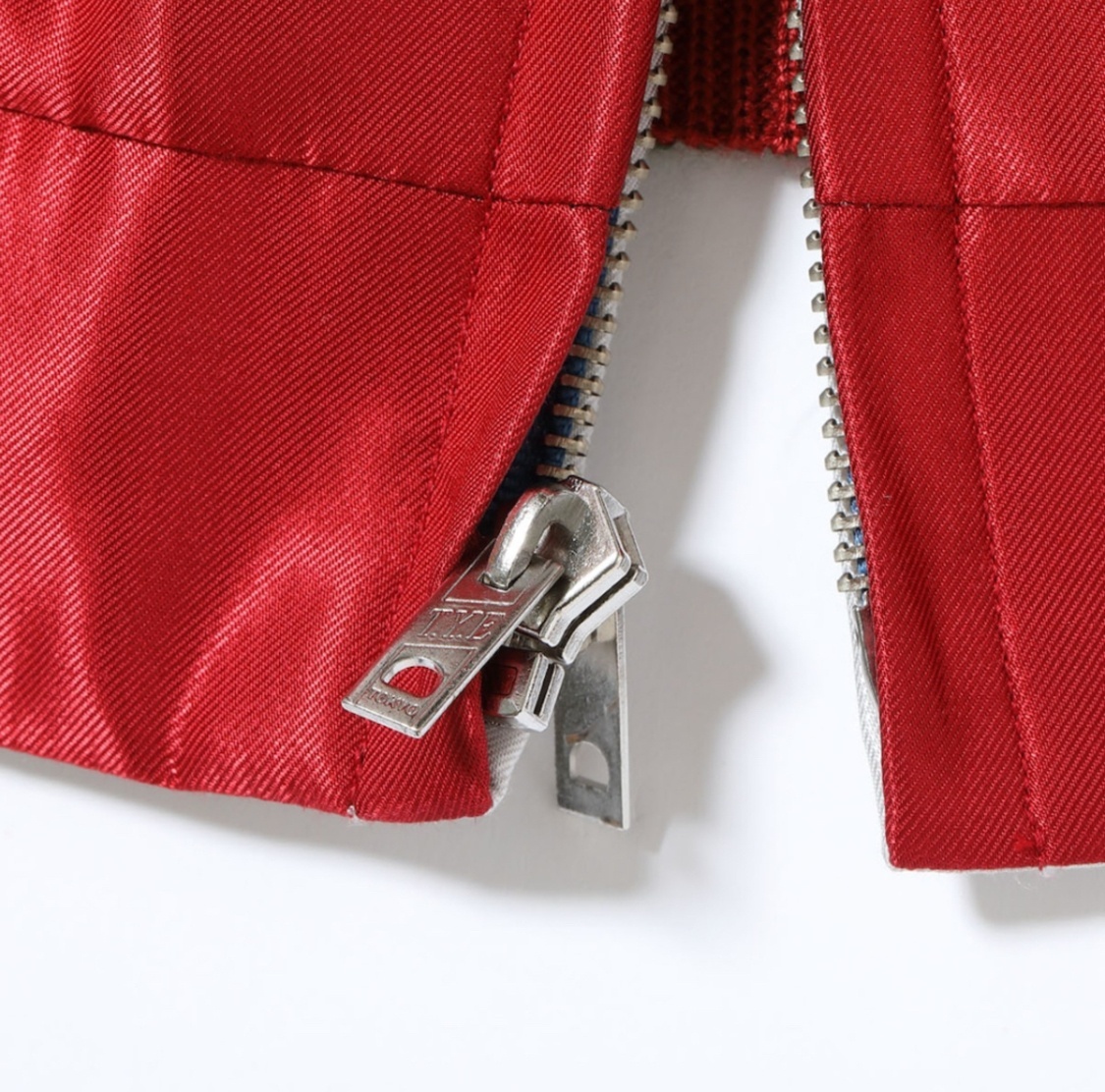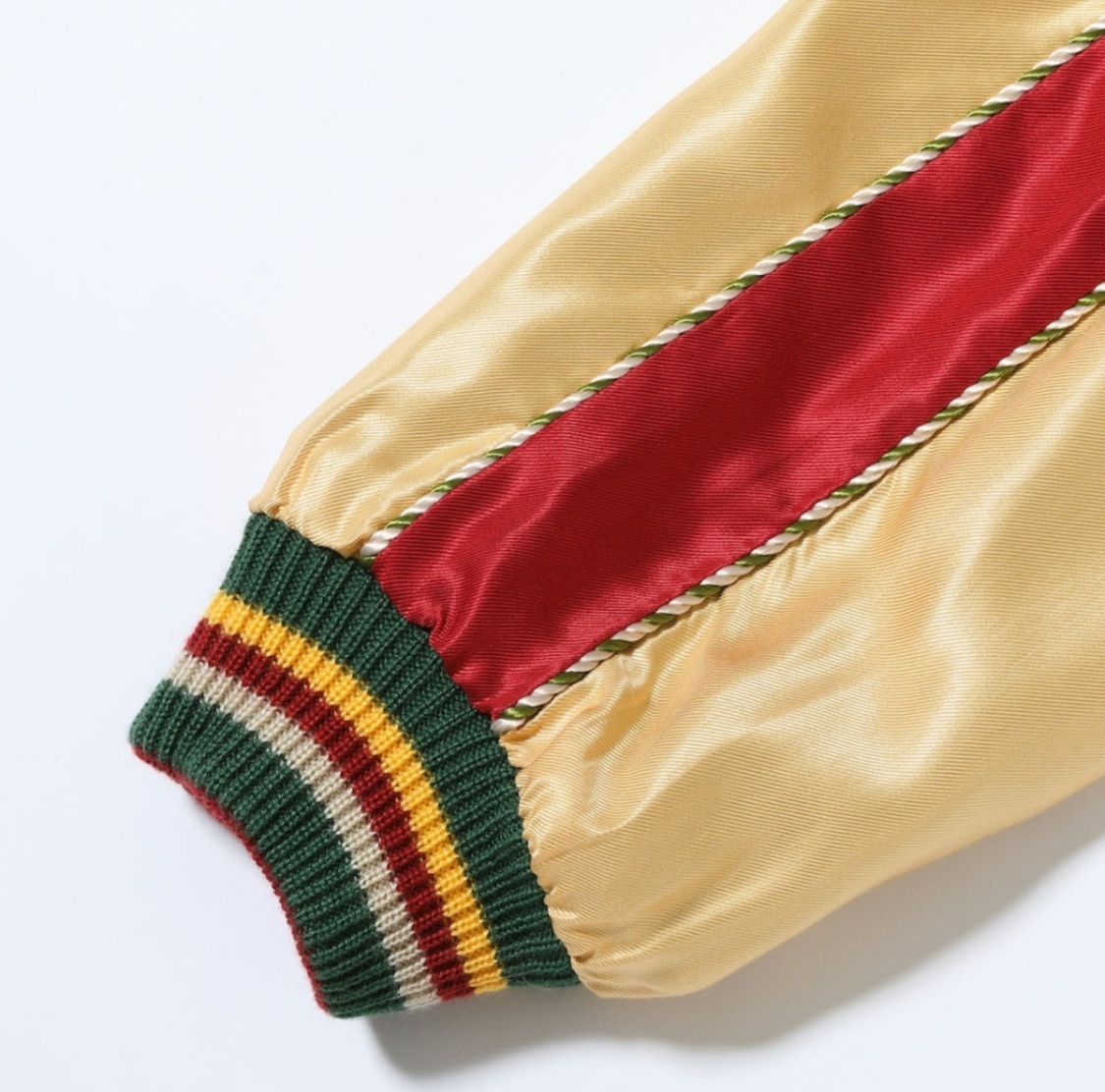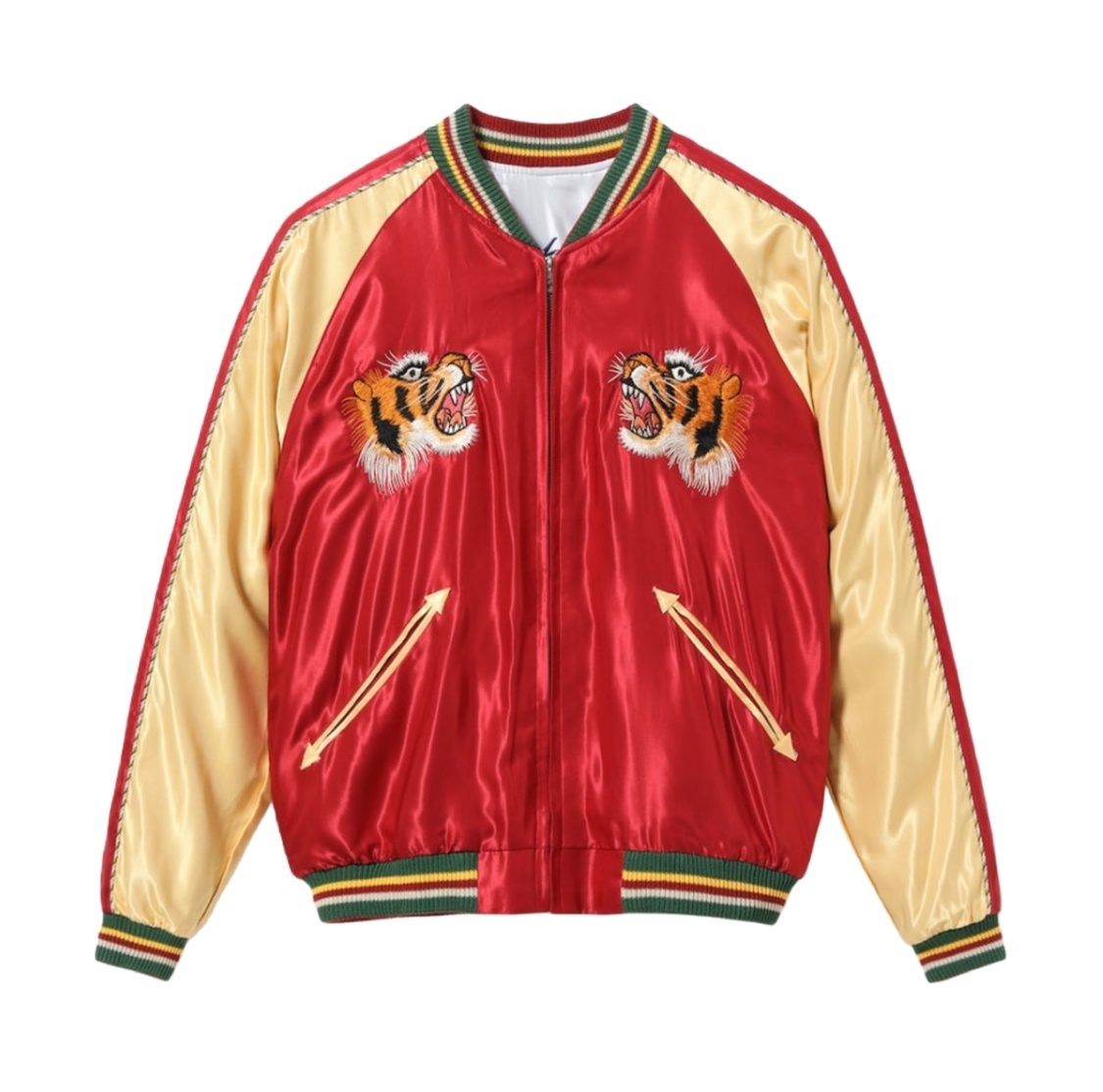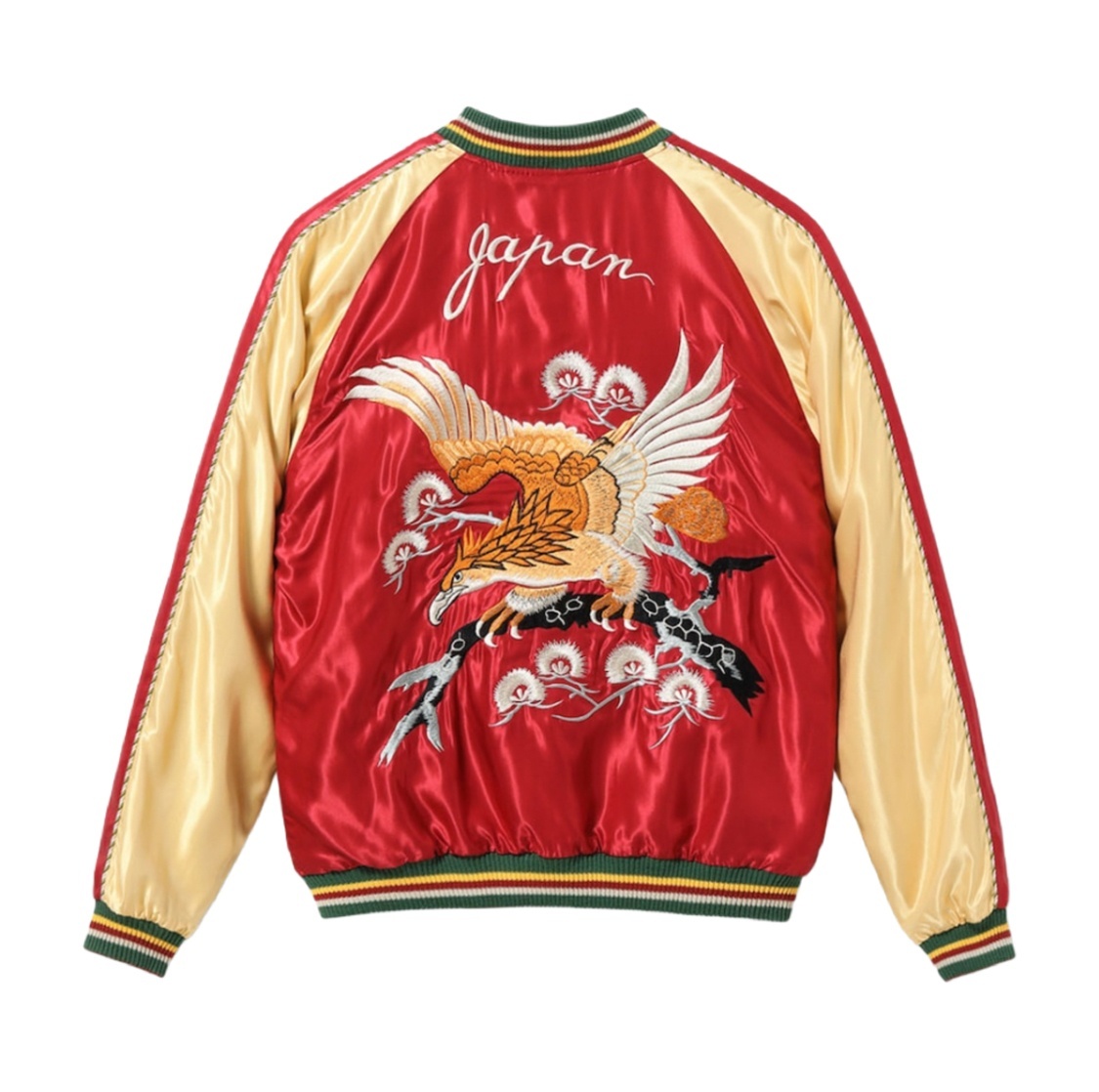 スーベニアジャケットのなかで最もスタンダードな両面にアセテート生地を使ったリバーシブルタイプ。戦後当時のスカジャンには、シルクに似た高級感を持つ物資統制外品目のアセテートが使われていた。中綿がないため季節を問わず着用でき、独特なドレープ感も魅力といえる。