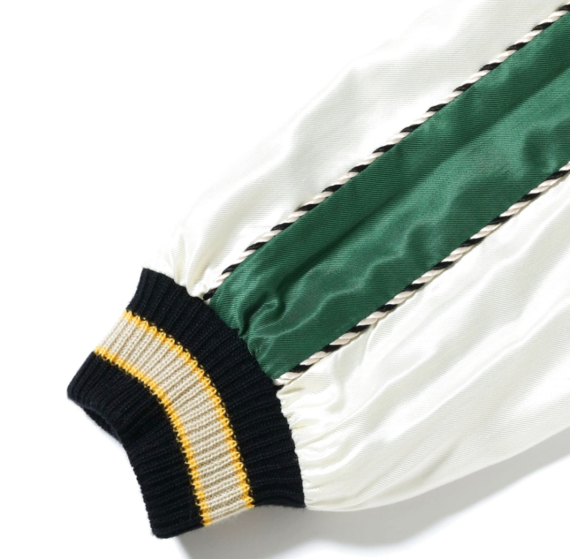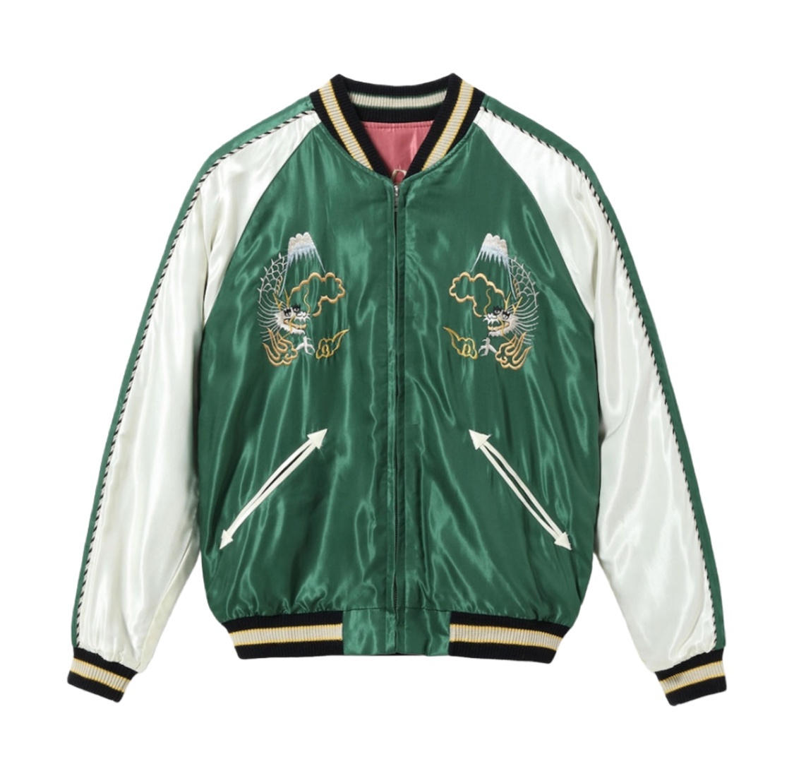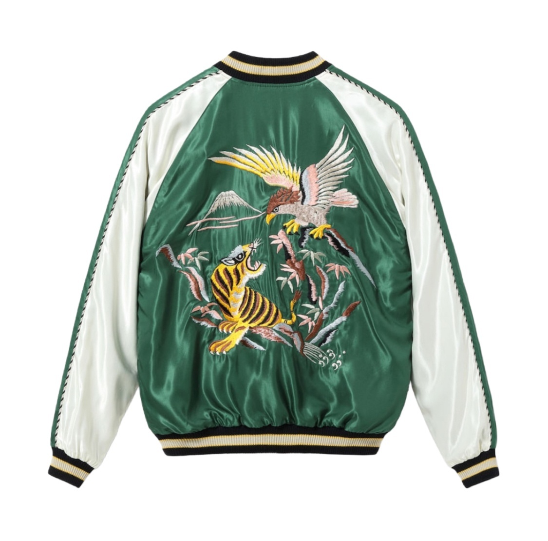 スーベニアジャケットのなかで最もスタンダードな両面にアセテート生地を使ったリバーシブルタイプ。戦後当時のスカジャンには、シルクに似た高級感を持つ物資統制外品目のアセテートが使われていた。中綿がないため季節を問わず着用でき、独特なドレープ感も魅力といえる。