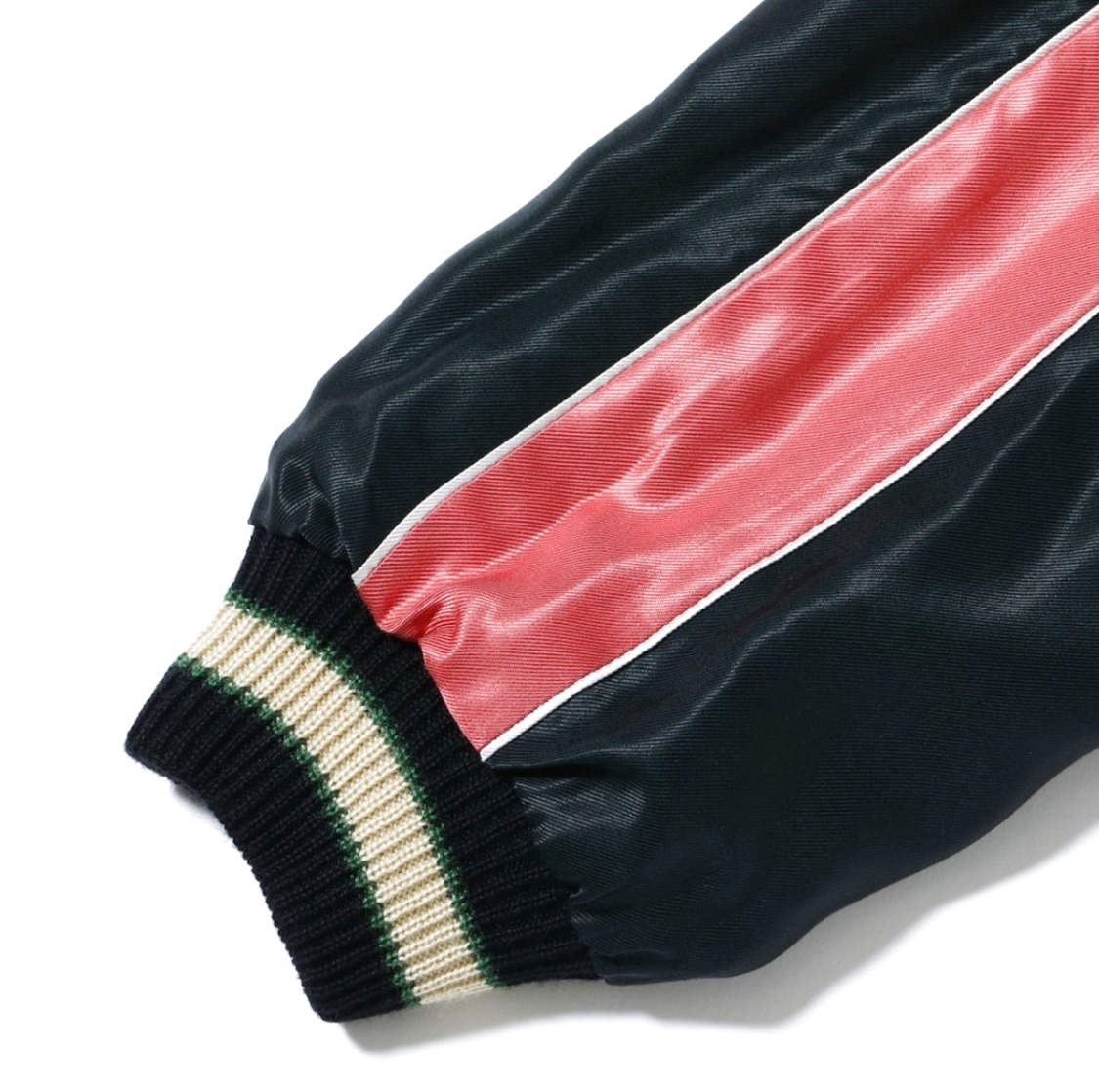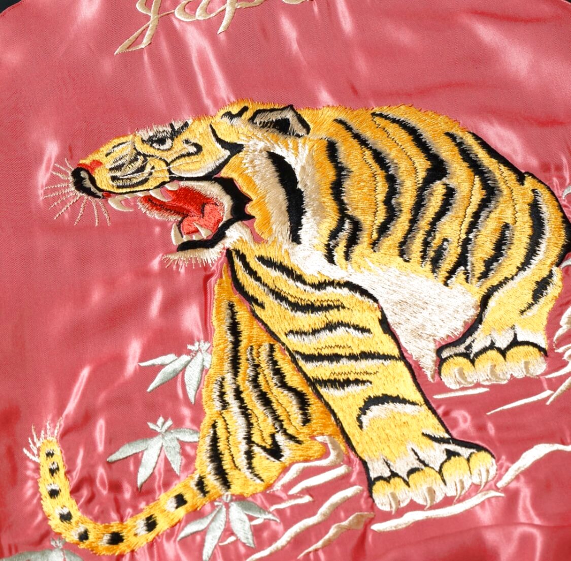 リバーシブル面はスカジャンの王道として人気も高い、咆哮する虎の絵柄。振り幅の狭い横振り刺繍で筋骨隆々な虎の体躯を写実的に描写しており、これは優れた技術を持つ熟練の職人にしか成し得ない業である。ボディは身頃より袖下の色の方が濃い、通称「逆配色」。ピンク×ブラックの組み合わせはフィフティーズカルチャーにおいて絶大な評価を得ている。