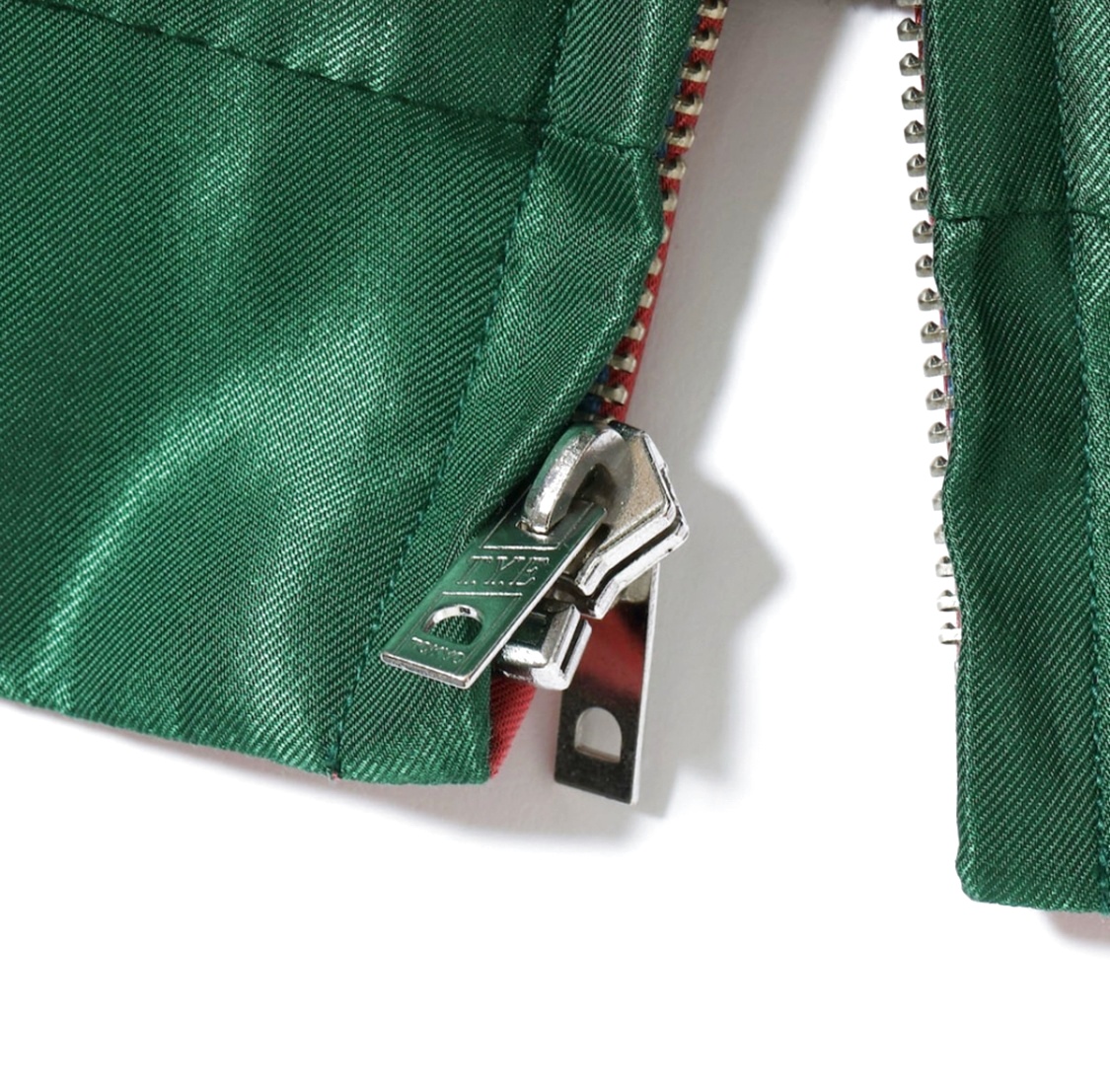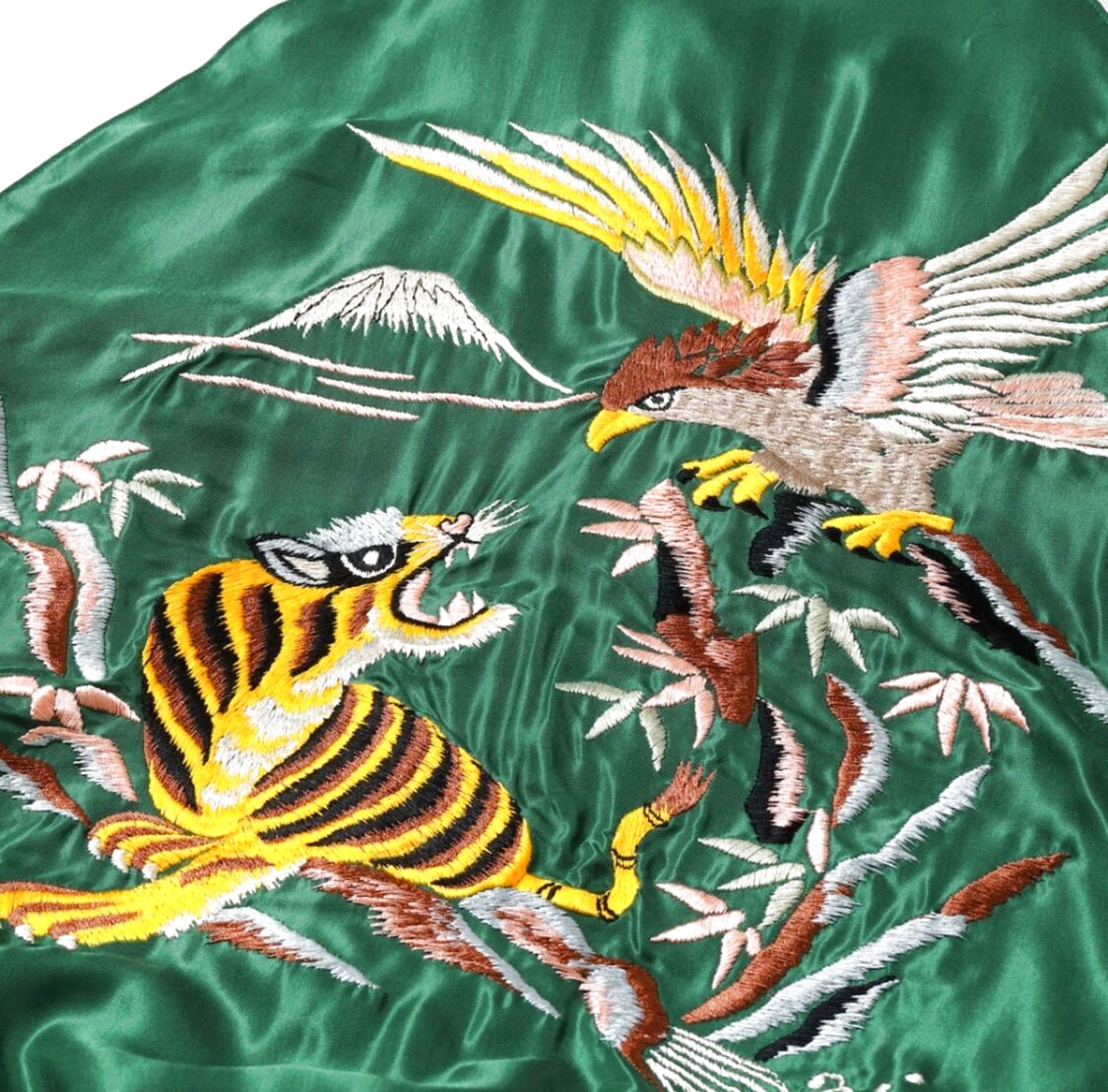 表面はヴィンテージスカジャンの中でも珍しい、鷲と虎が睨み合う1950年代中期の絵柄。Japanの文字が無いため、デフォルメしたそれぞれのモチーフを主役級の大きさで刺繍しているのが特徴。鷲の翼のグラデーションや虎の縞模様は、カラフルな色糸を駆使して緻密に描写。胸の龍は生地のグリーンを生かし、細いラインで繊細に表現されている。