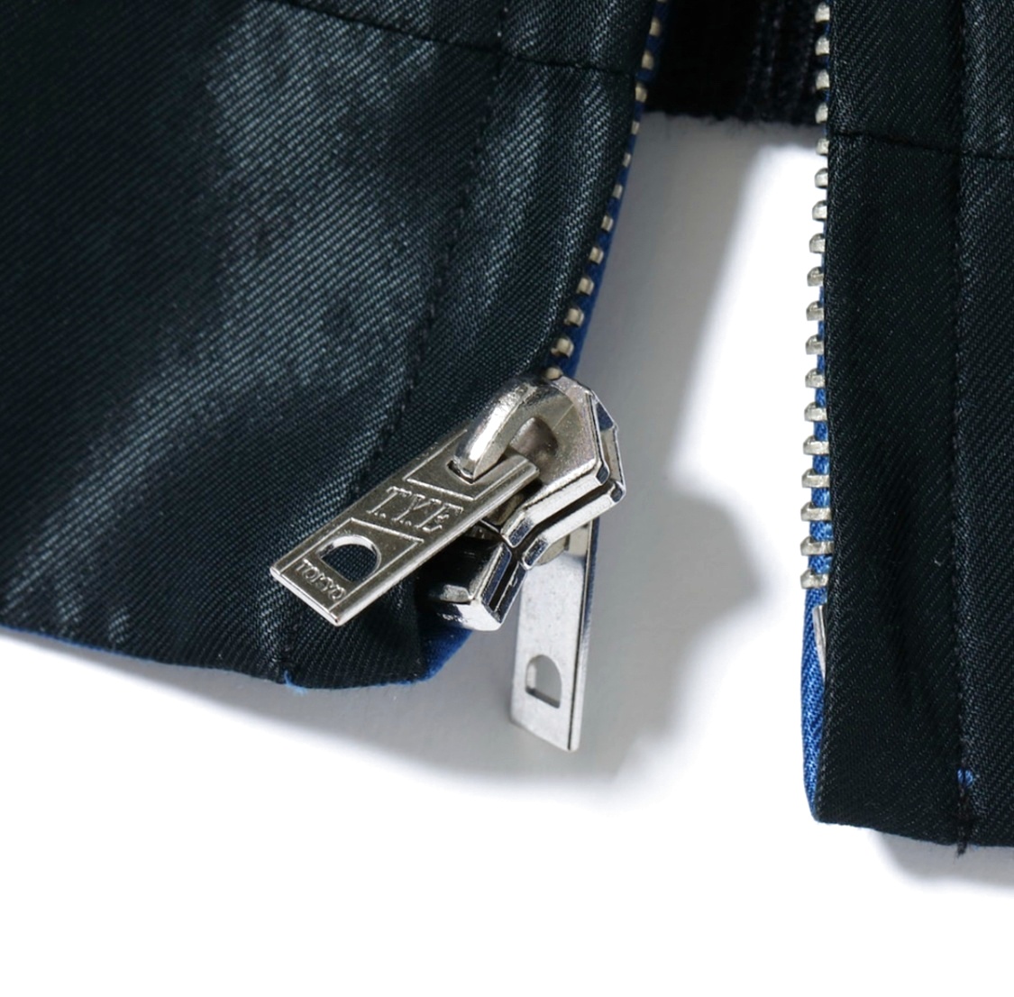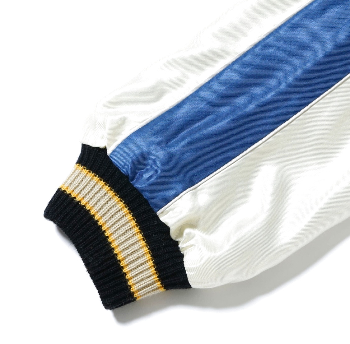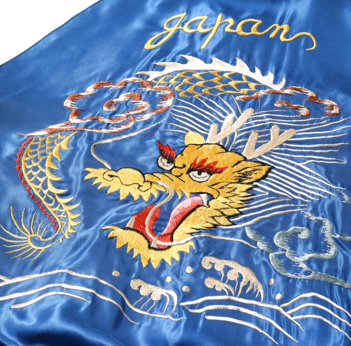 リバーシブル面は波飛沫とともに水辺から姿を現す金龍の絵柄。晴天を想わせるブルーのボディをベースに、長い体躯を雲間に隠しながら迫り来るダイナミックな構図が特徴で、龍の顔にのみ黒いアウトラインを入れることで遠近感と迫力を強調している。胸には鷲と虎が描かれており、スカジャンの三大モチーフである鷲・虎・龍が揃った贅沢な一着。