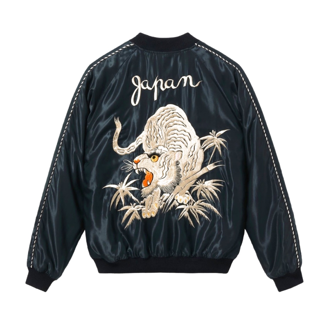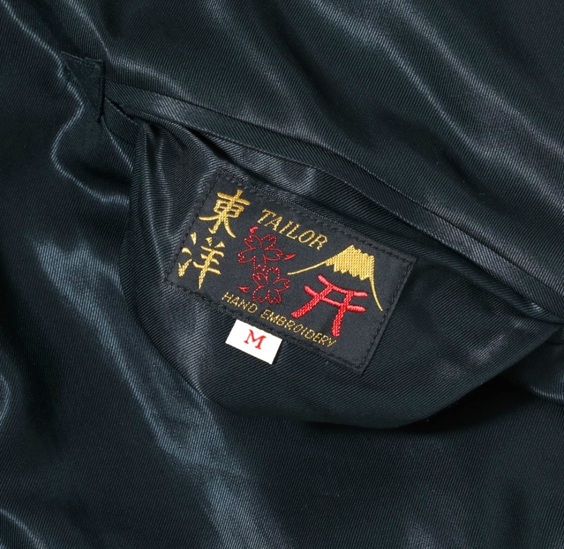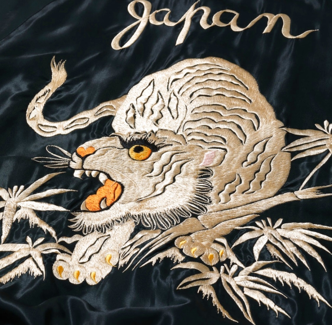 表面はヴィンテージの虎柄の中でも珍しい、斜め上からのアングルで白虎を描いた1950年代中期の絵柄。針足を駆使しつつ、虎斑の縞模様を刺繍で埋めずに生地のブラックを部分的に見せることで輪郭を強調し、立体的に表現している。黒一色のボディに漆黒のリブ、黒白のパイピングなどモノトーンを基調としたボディに白虎が映えるシックな仕上がり。