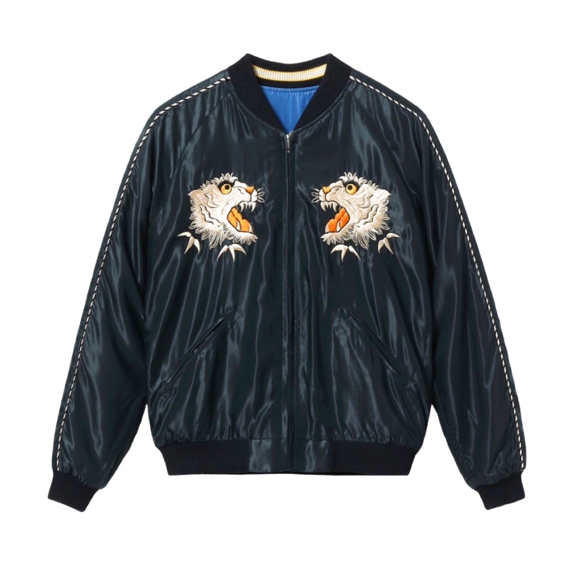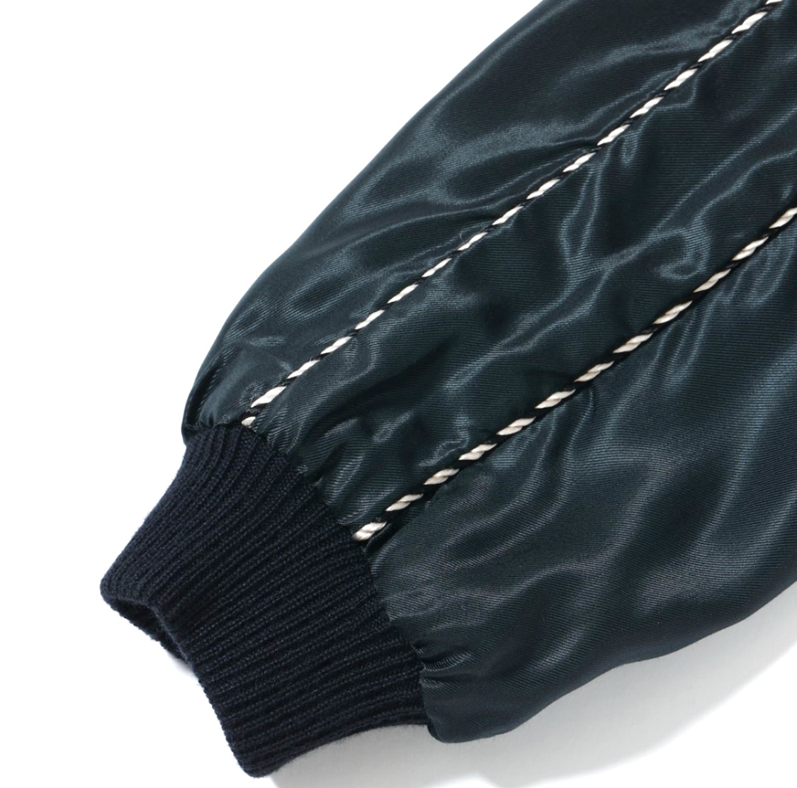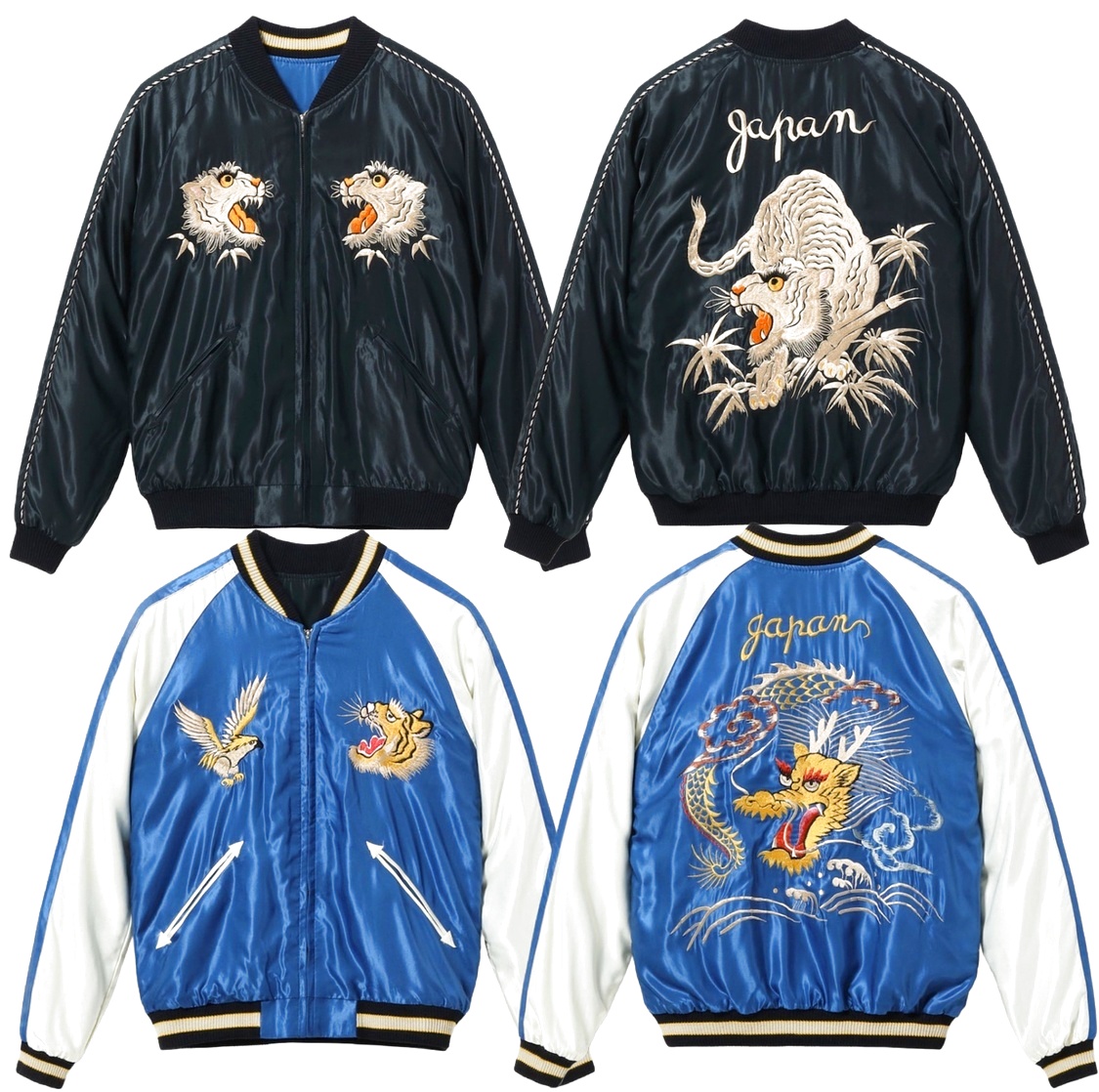 スーベニアジャケットのなかで最もスタンダードな両面にアセテート生地を使ったリバーシブルタイプ。戦後当時のスカジャンには、シルクに似た高級感を持つ物資統制外品目のアセテートが使われていた。中綿がないため季節を問わず着用でき、独特なドレープ感も魅力といえる。
