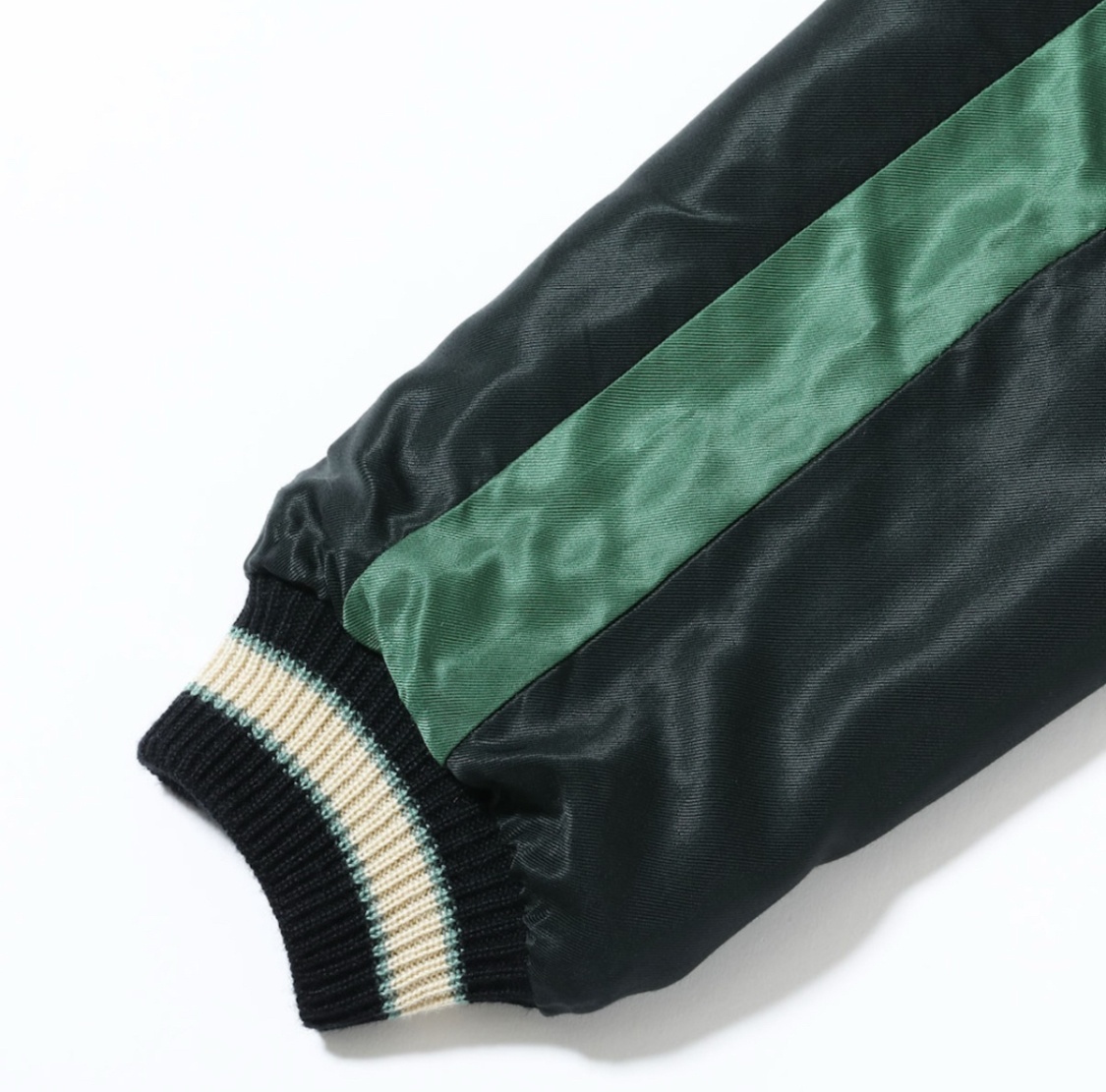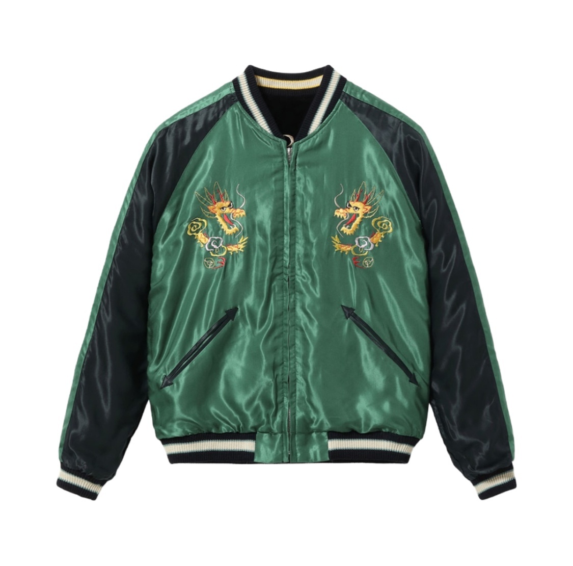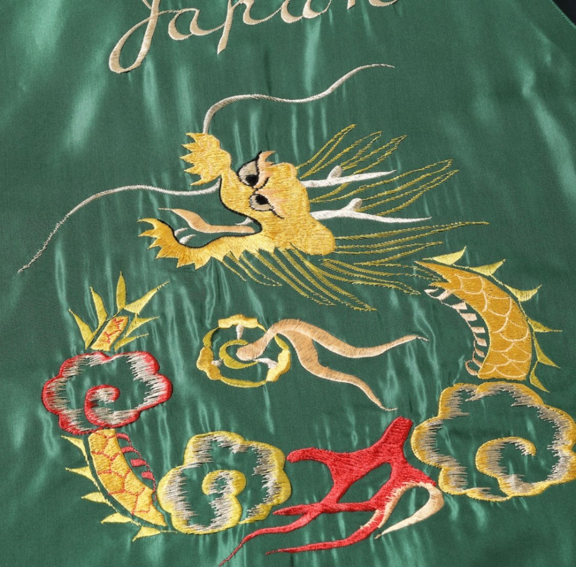 リバーシブル面は、身頃より袖下の色の方が濃い「逆配色」。グリーン×ブラックのダークトーンのボディには、金龍に使われているイエローや淡いピンクの色糸が映える。