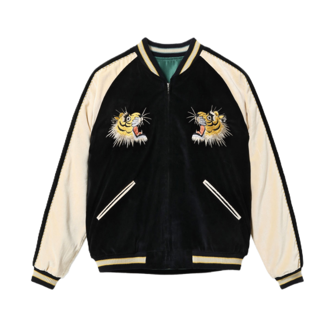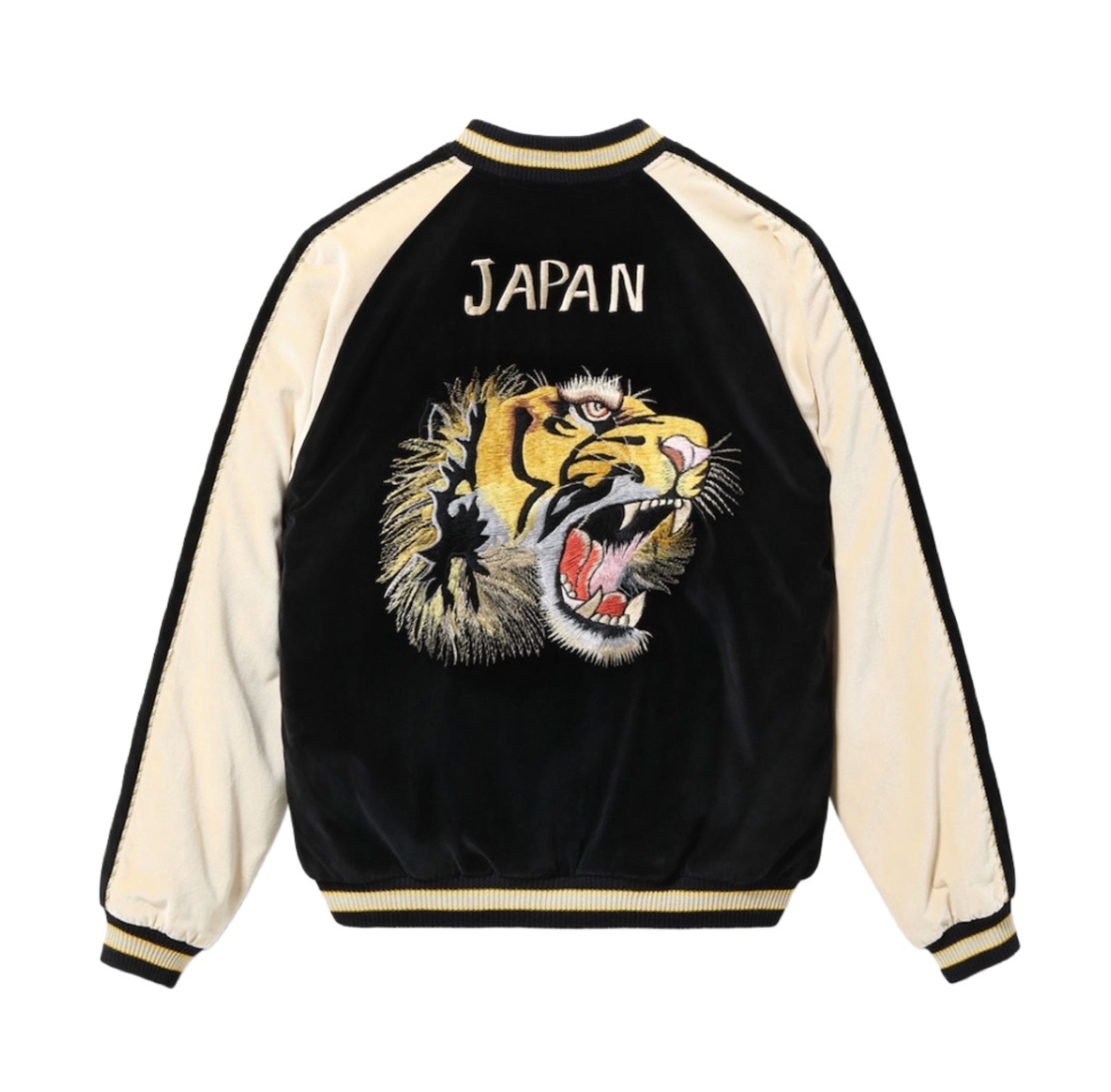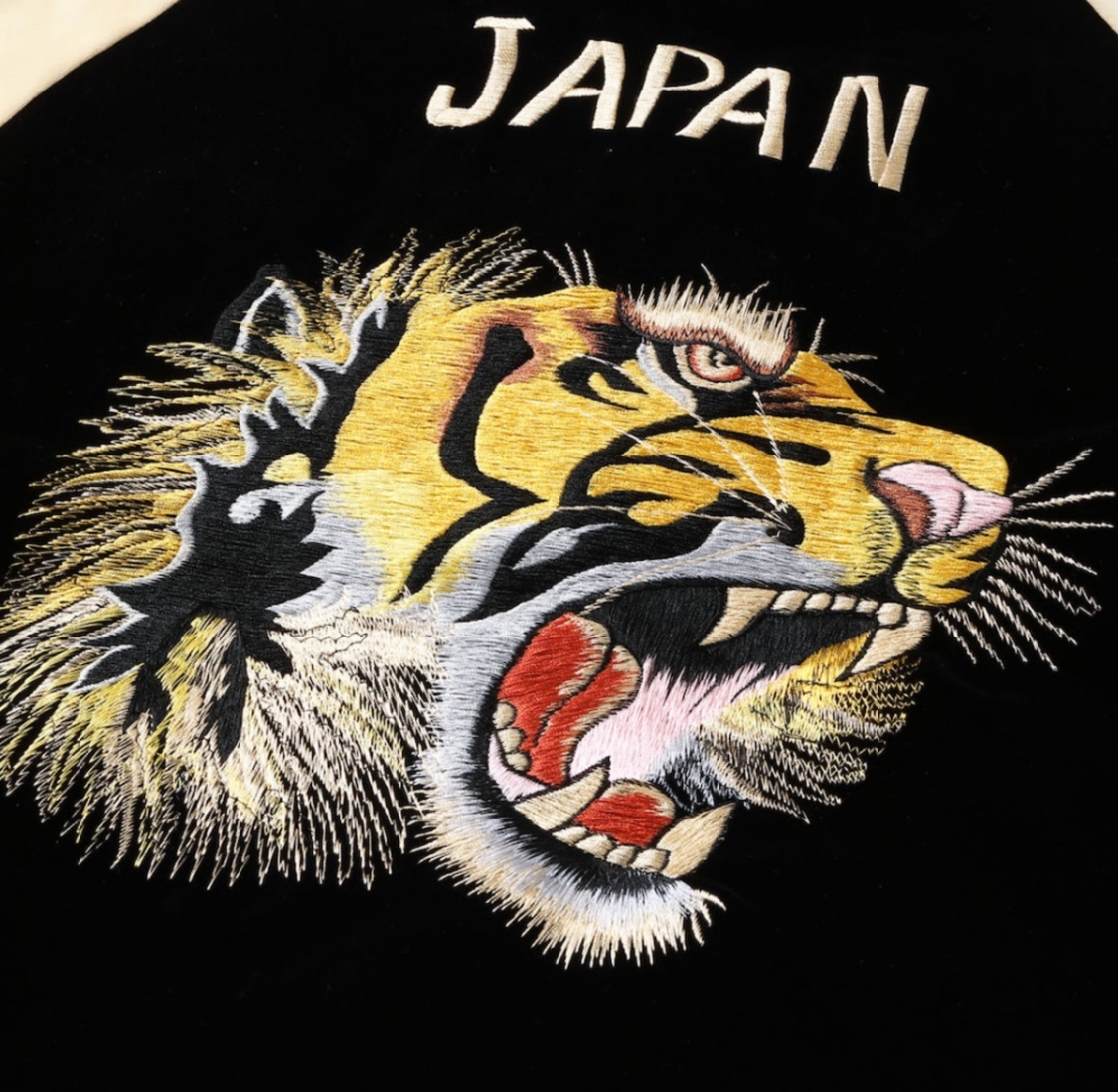 ヴィンテージではウルトラレアと言っても過言ではない別珍2トーンのモデルを新たに展開。サテンのスカジャンと同じように身頃と袖下の色を切り替えているが、仕上がりは全くの別物であり、ただならぬ存在感を醸し出している。刺繍は1950年代中期の作品をもとに、虎の顔を細部まで緻密に表現した「タイガーヘッド」と呼ばれる人気の絵柄。頬の毛や鬣は針足を何度も変えながら一本一本繊細に描かれており、優れた職人の手掛けた刺繍であることがわかる。
