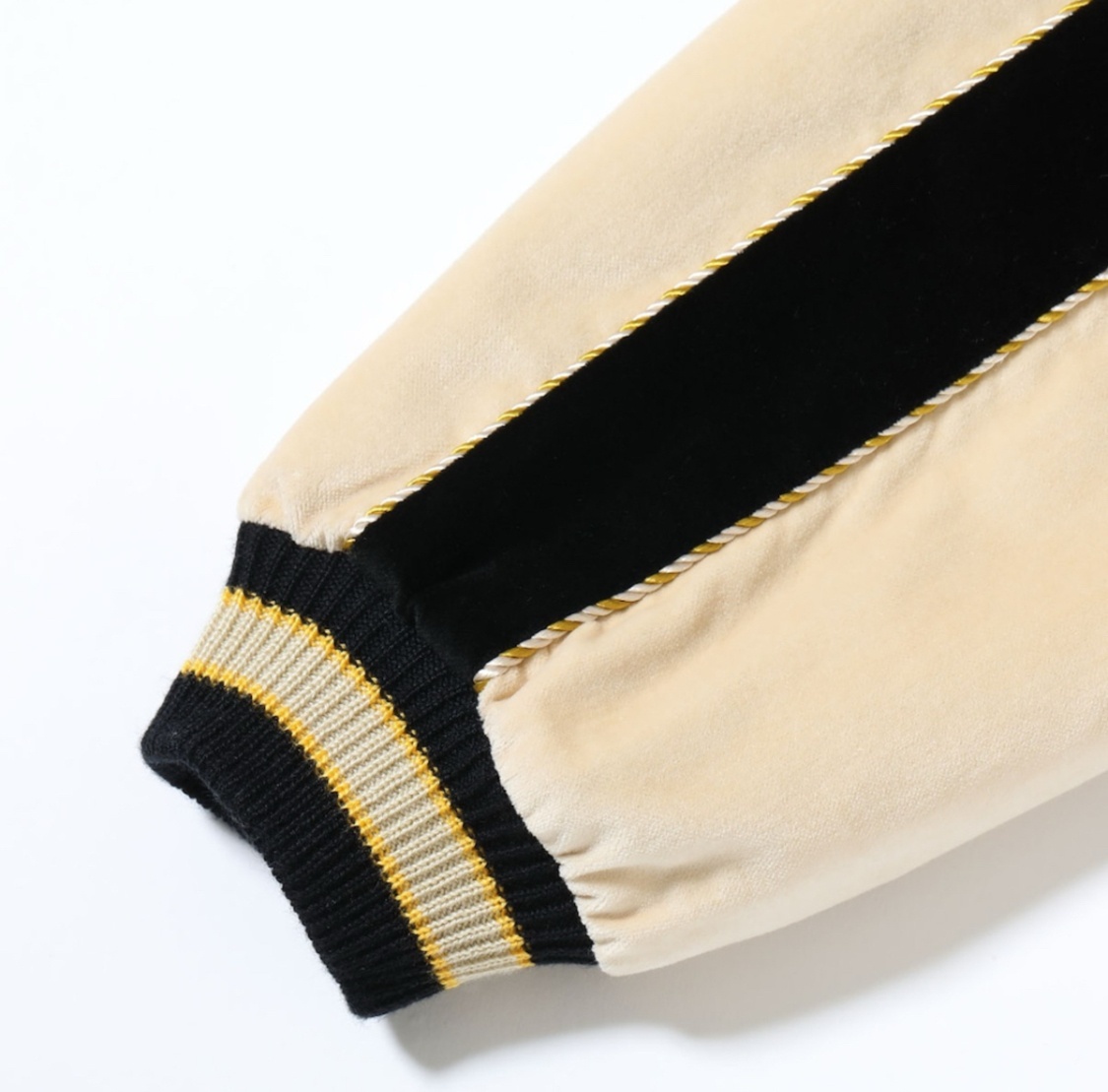 2色の別珍生地を使い、身頃と袖下で2トーンに切り替えたスーベニアジャケット。ヴィンテージにも実在するが、世界でまだ数着しか確認されていない希少なモデル。通常の別珍と異なり、現存する個体はどれも中綿無し。リバーシブル面はサテン生地だがキルティングステッチは入らない仕様である。