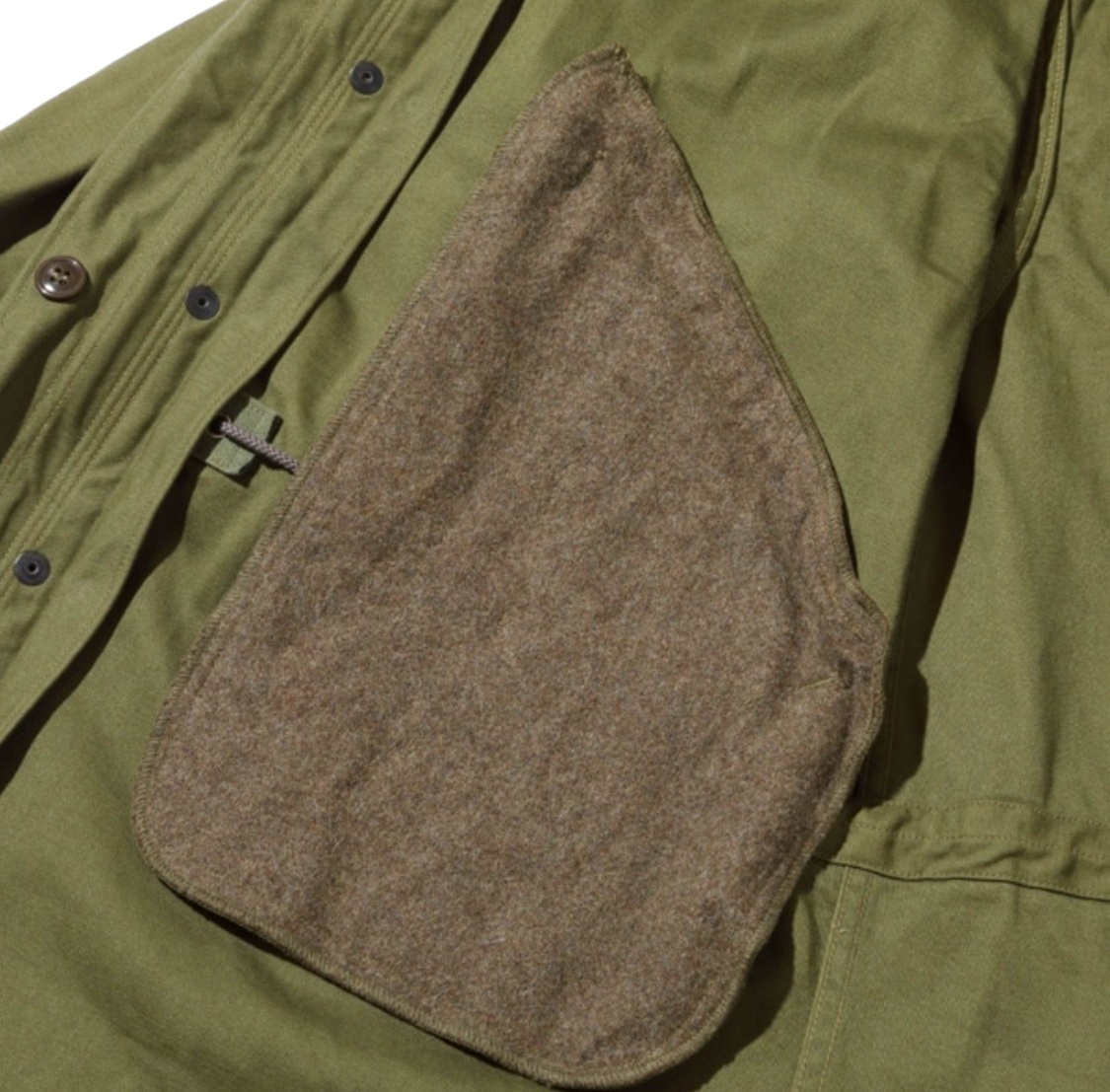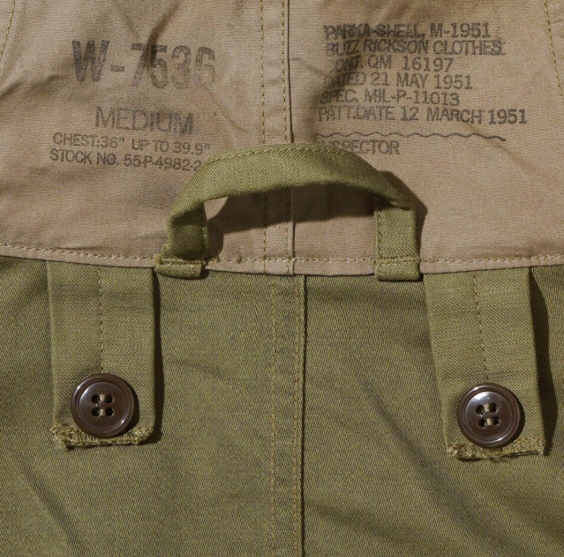 M-51パーカーは第二次大戦から発展してきたプルオーバー型のM-48パーカーを進化させたもので、朝鮮動乱の寒冷地において主に米陸軍章将兵に支給された。この戦地は米軍がかつて経験した事の無い寒冷地であることから、通常の装備の上から着用するレイヤー(重ね着)システムが採用された。最初期型(1951年)のシェルは厚手のコットンサテン地であったが、1952年以降のモデルでは、コストの見直しや軽量化を図って、コットンナイロンのオックスフォード地に変更されている。袖口は、密封性を高めるためのラバーストラップアジャスターベルトが内蔵され、ポケットの袋地には保温性のあるウール素材が使用されている。