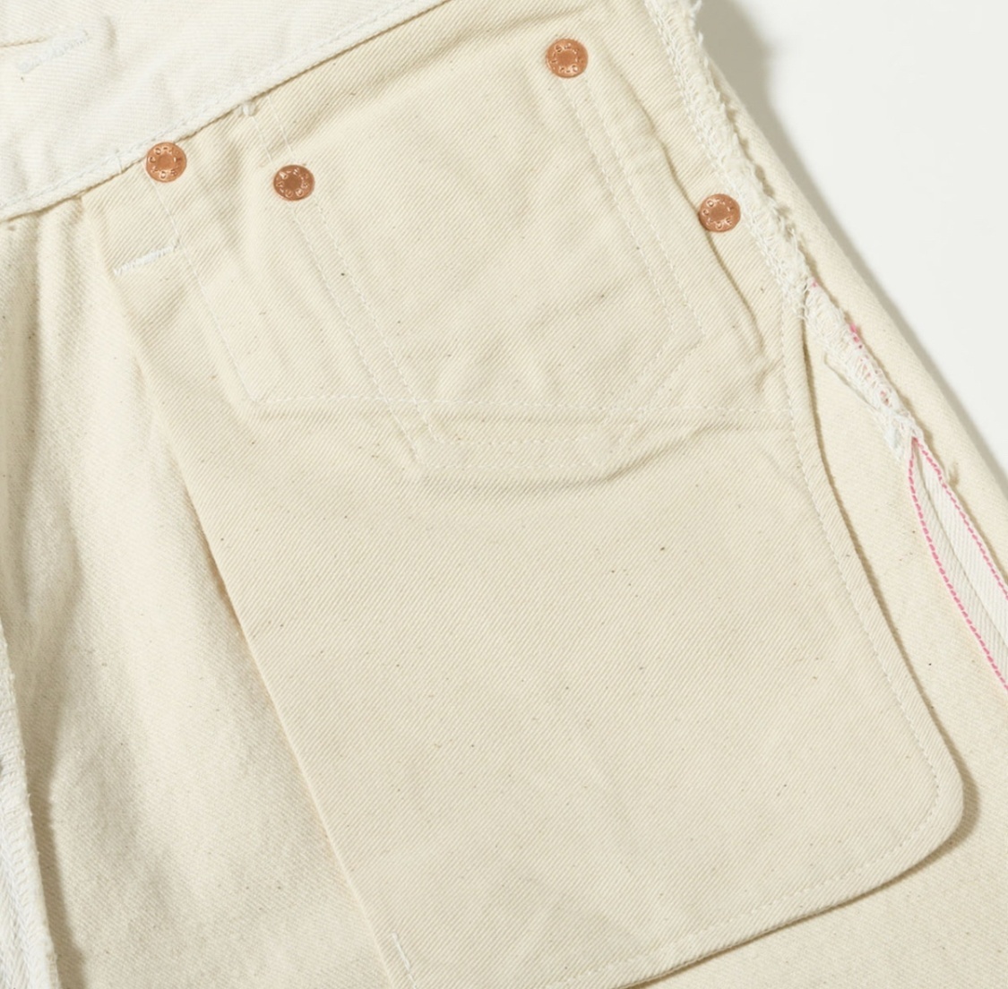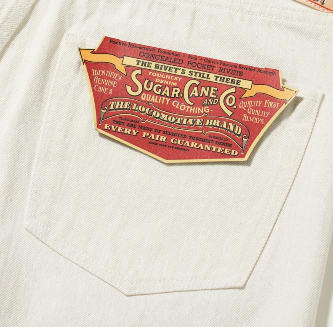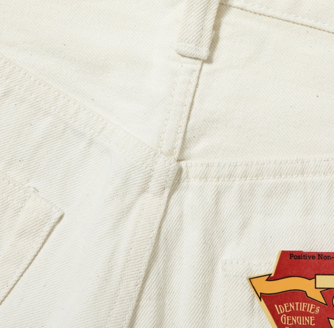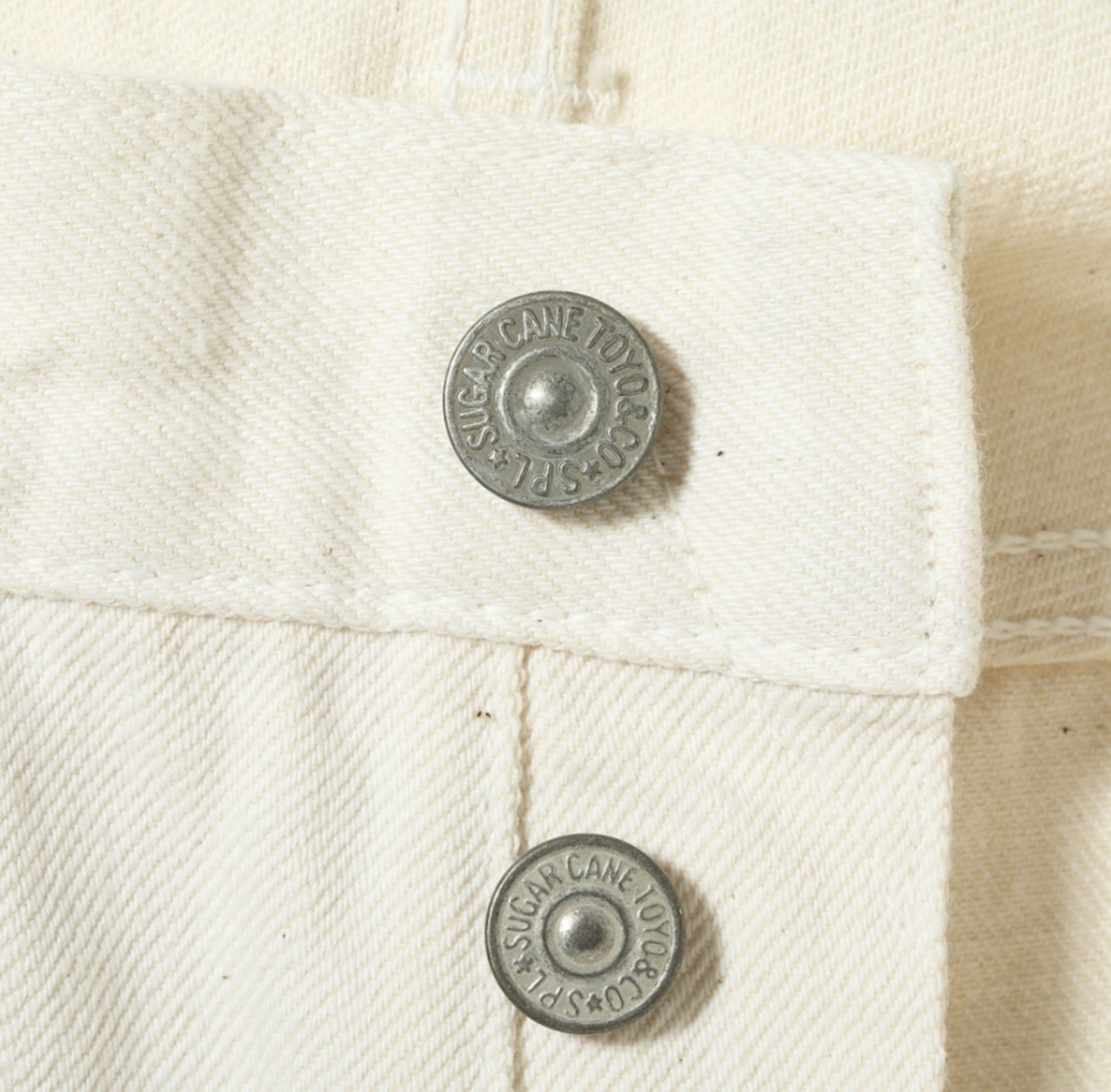 1940年代後半のジーンズにみられる贅沢なディテールを余すところなく再現したシュガーケーンの代表作「1947モデル」を経糸にホワイト、緯糸に生成の糸を使用したオリジナルのホワイトデニムで仕上げた。経糸7番×緯糸7番のムラ糸を旧式のシャトル織機で織り上げた13オンスのセルビッジデニムであり、両脇に赤耳を確認できる。