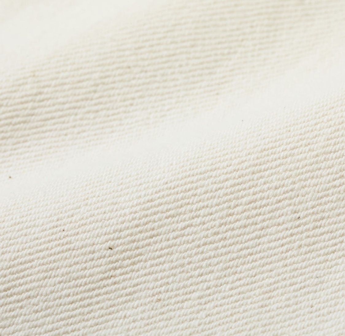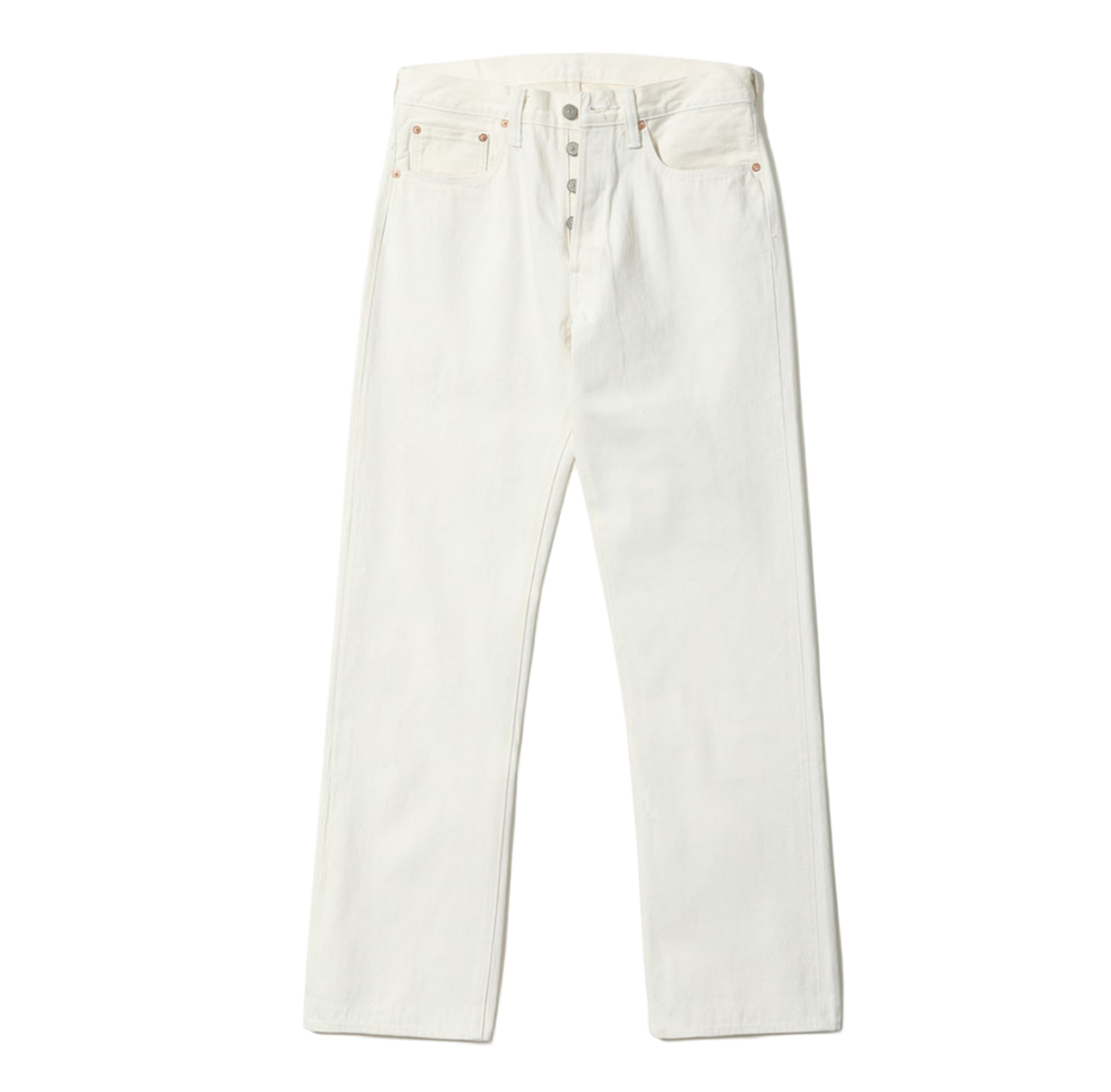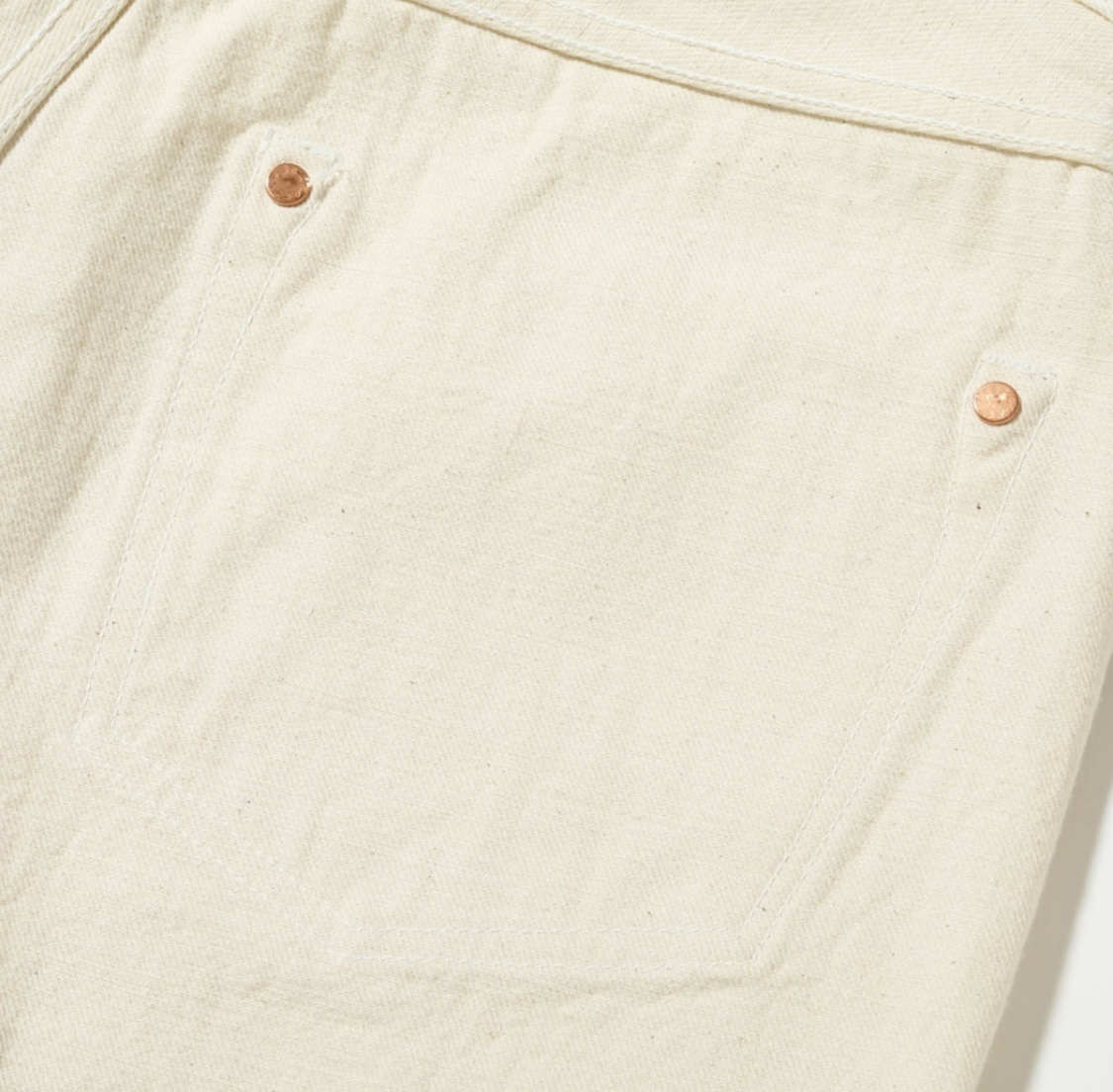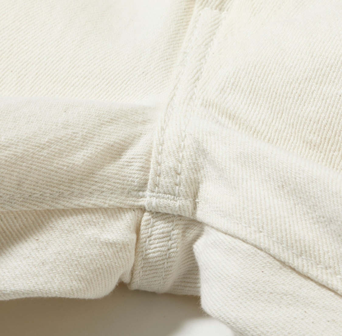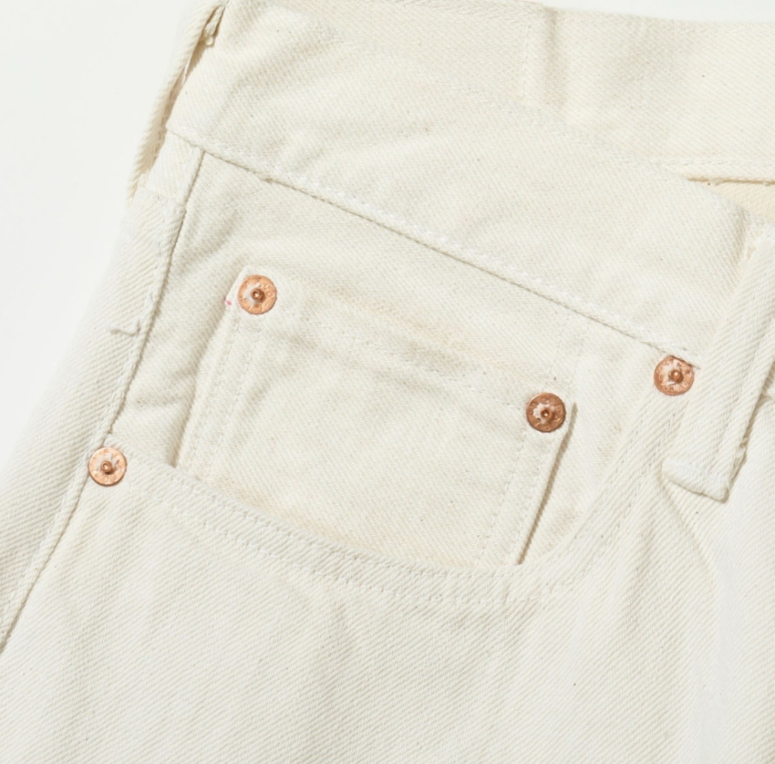 1940年代後半のジーンズにみられる贅沢なディテールを余すところなく再現したシュガーケーンの代表作「1947モデル」を経糸にホワイト、緯糸に生成の糸を使用したオリジナルのホワイトデニムで仕上げた。経糸7番×緯糸7番のムラ糸を旧式のシャトル織機で織り上げた13オンスのセルビッジデニムであり、両脇に赤耳を確認できる。