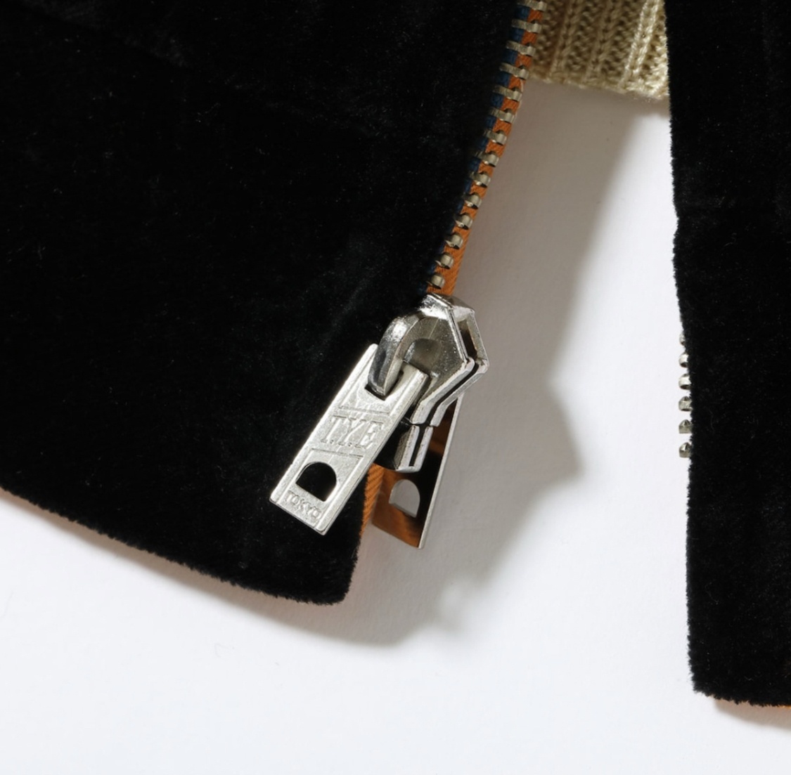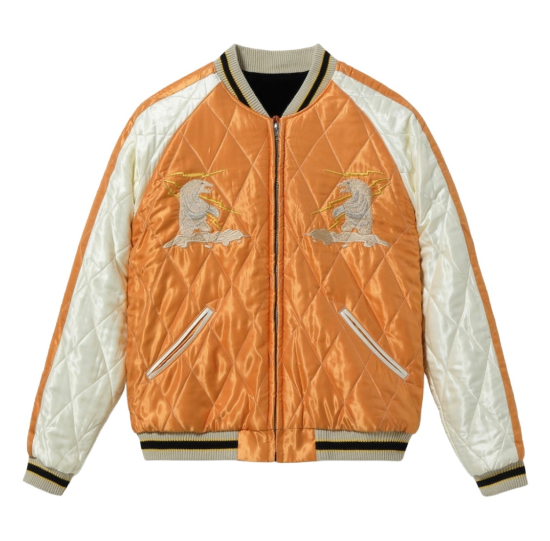 初期のスーベニアジャケットはアセテート生地のリバーシブル仕様が多いが、当時のバリエーションとして毛羽感のある別珍(べっちん)生地を使ったモデルも存在する。中綿を入れることで防寒性を高め、リバーシブル面のアセテートには中綿を押さえるためのキルティングが施されていた。
