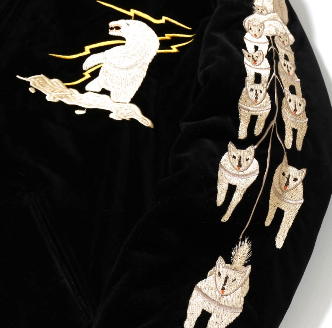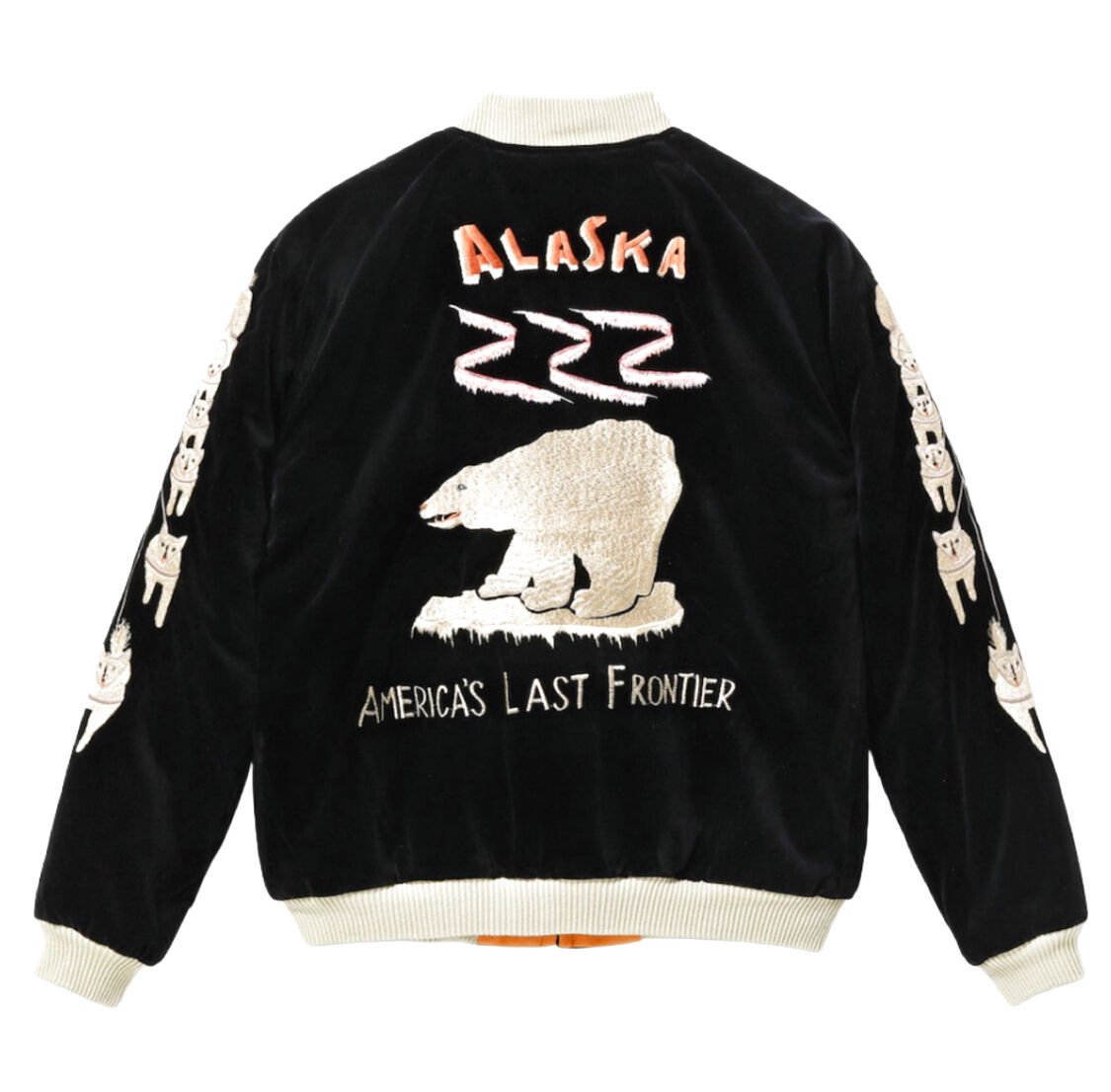 アラスカをモチーフとした通称「アラスカジャン」。稲妻と白熊の柄が有名だが、この流氷と白熊の柄も実在するヴィンテージを再現。ただでさえ希少なアラスカジャンのなかでもスーパーレアな一着と言えるだろう。共に描かれているのは極寒の地でしか見ることのできないオーロラ。袖には人気の犬ぞりの刺繍も入っている。