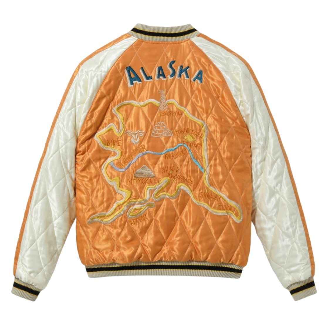 リバーシブル面はアラスカのマップ柄。ブルーのALASKA の文字は、オレンジのボディとの組み合わせならではの配色。1950 年代後期に米軍から依頼され「港商」が製作し、アラスカ米軍基地内のPXに並んだ作品で、当時はアラスカの写真やポストカードをもとに職人が絵柄をデザインしていた。