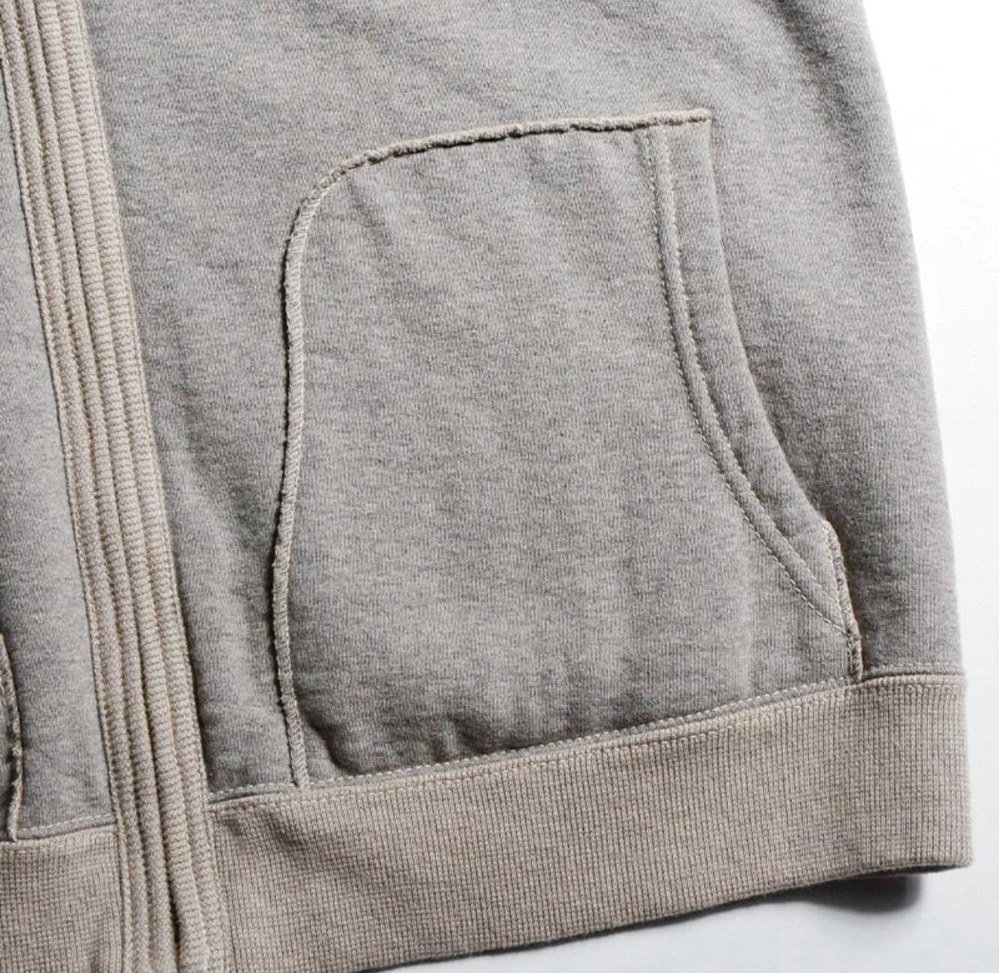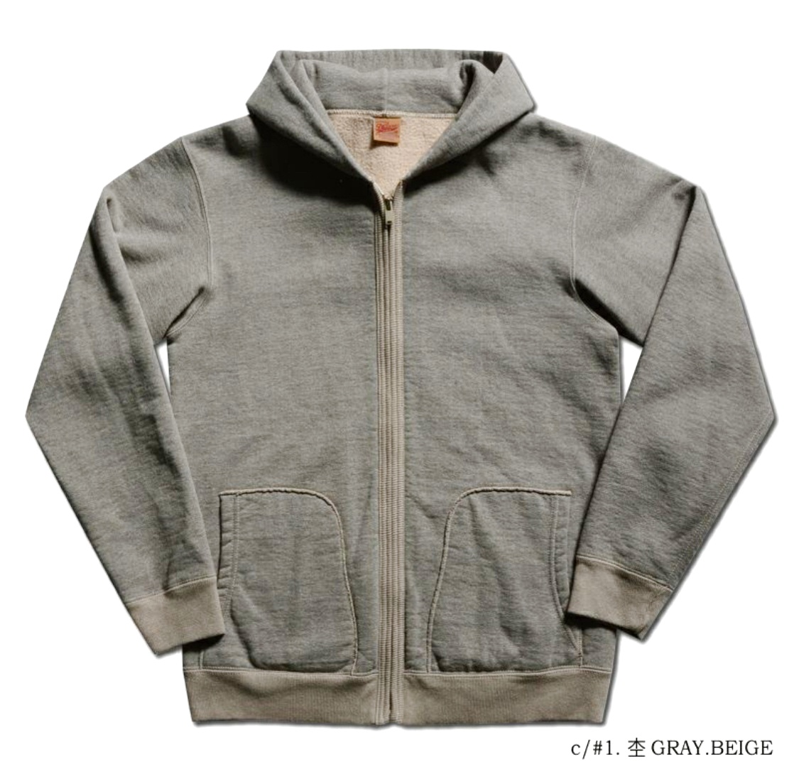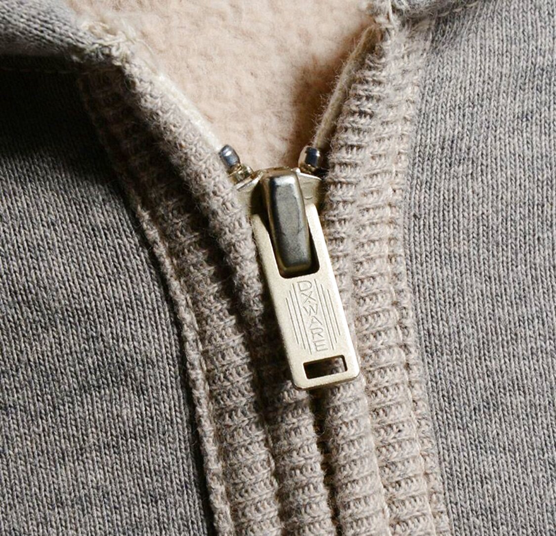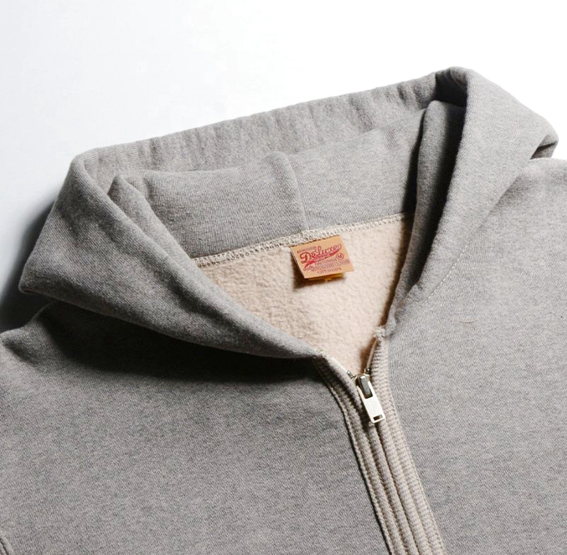 最厚ヘビーウエイトの吊裏毛で創るSPZシリーズのフルジップパーカー。長く皆様に愛されていますが、その実、製造には多くの技術を駆使していることを御存知でしょうか?このSPZシリーズは当社自社工場「オルダクト」で製造します。他のモデルと異なり、裾ラインの取り方と長い前立ての寸法が独特の型紙を使用しています。縫製する際に職人が手加減で縫い縮める分を型紙で伸ばし、ある個所を同じ運針で二度縫いするなど、緻密なモノ創りが成されています。