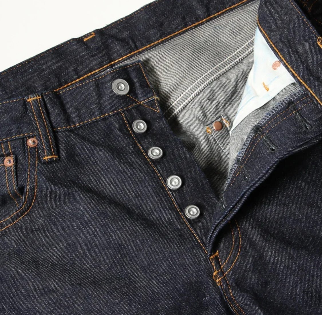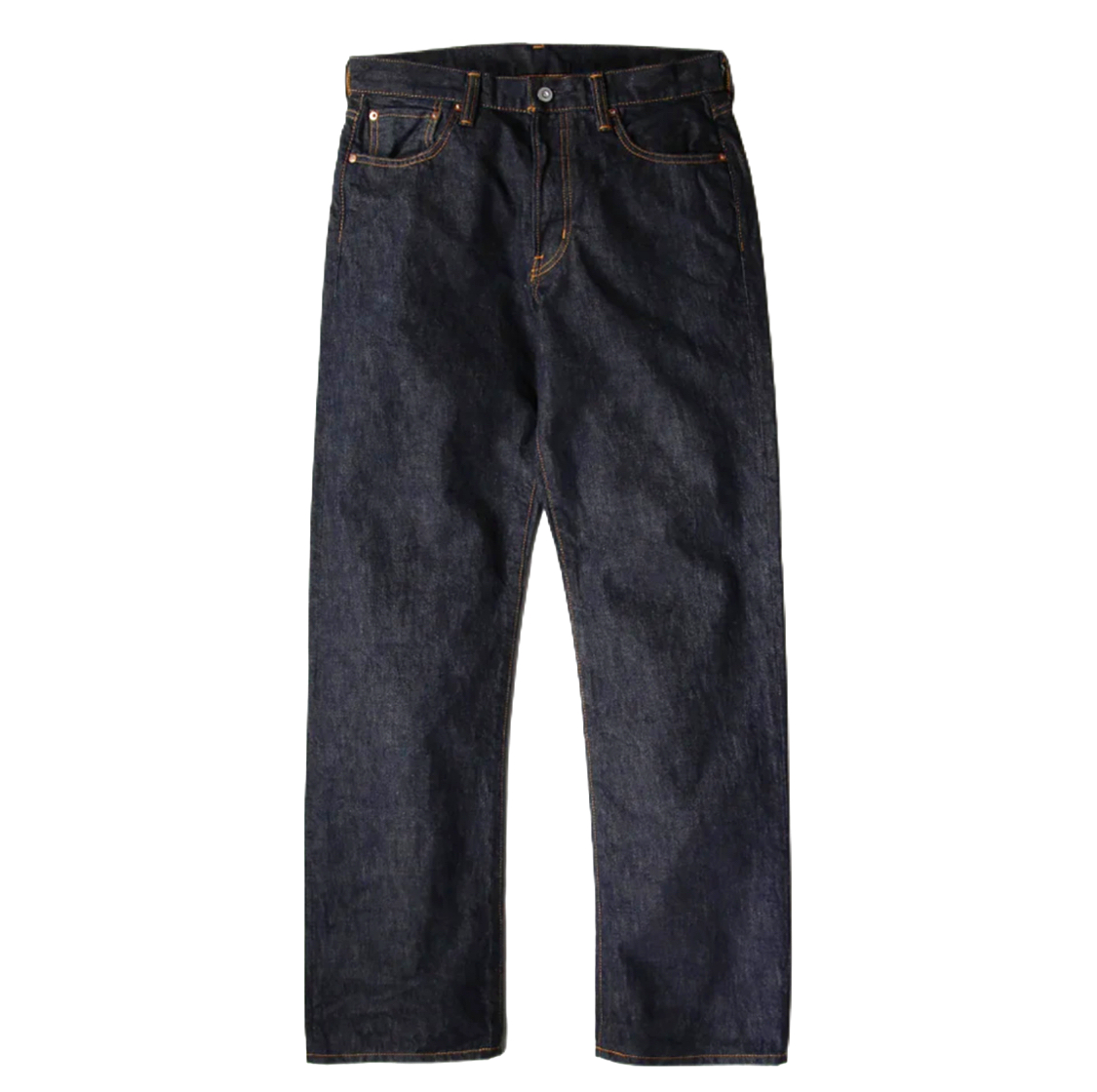 緯糸に茶綿を使用したセルビッチデニム『JUMBO DENIM』を使用した、ベーシックな王道ストレートシルエットのジーンズ。『ジーンズの原型』ともいえる基本のストレートシルエットをベースにヒップ周りを日本人の体型に合わせて補正。腰回りに自然なフィット感を持たせながらも、裾にかけて無骨に落ちるラインは、クラシックさと現代的な美しさを兼ね備えています。細部の仕様は隠しリベットや中盛りループなどヴィンテージディテールを踏襲しつつ、日常的に穿きやすいバランスに調整。長く付き合える“最良のベーシック”として、初めての一本にも、既にジーンズを愛する方のワードローブにもふさわしい仕上がりです。