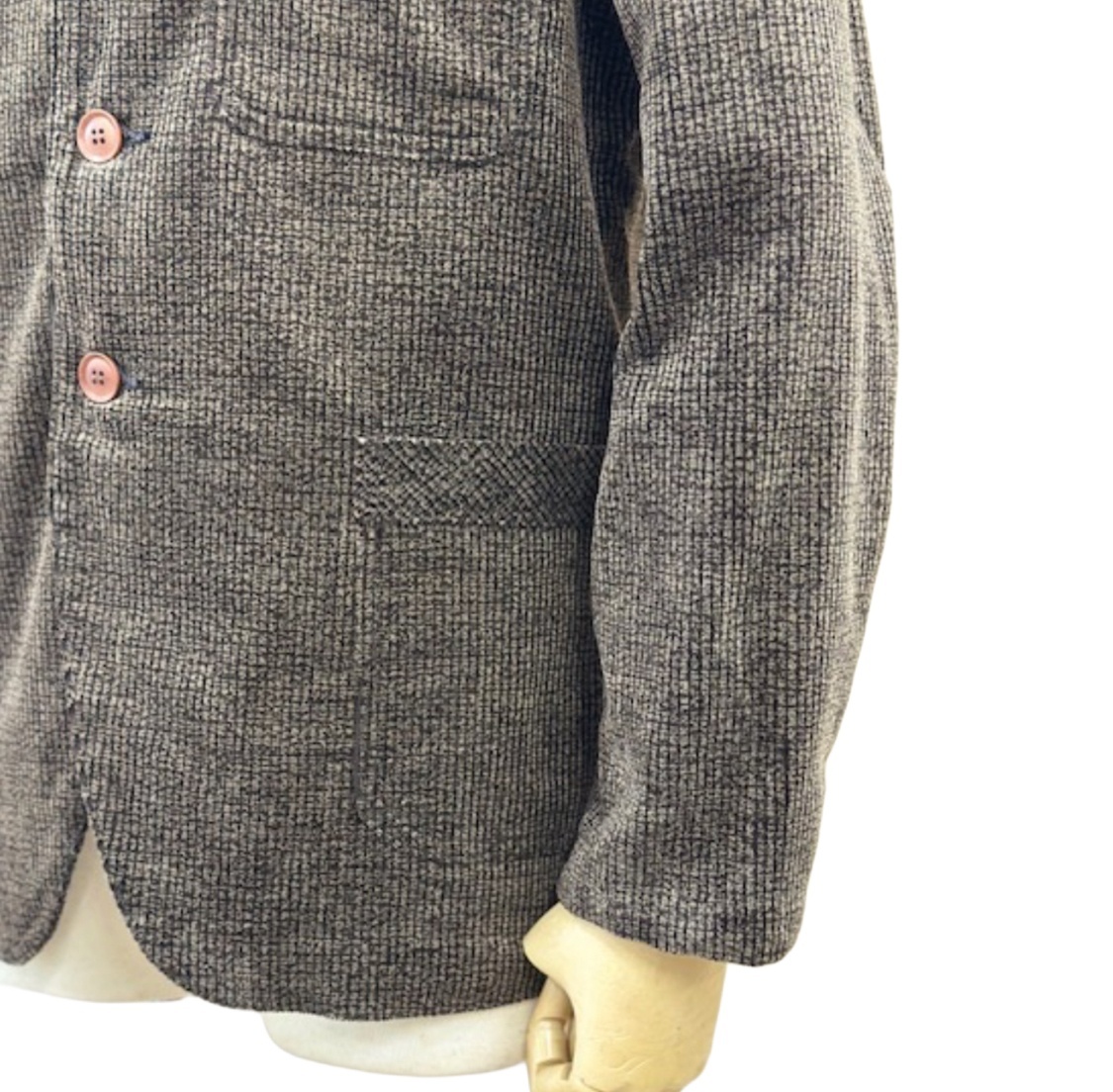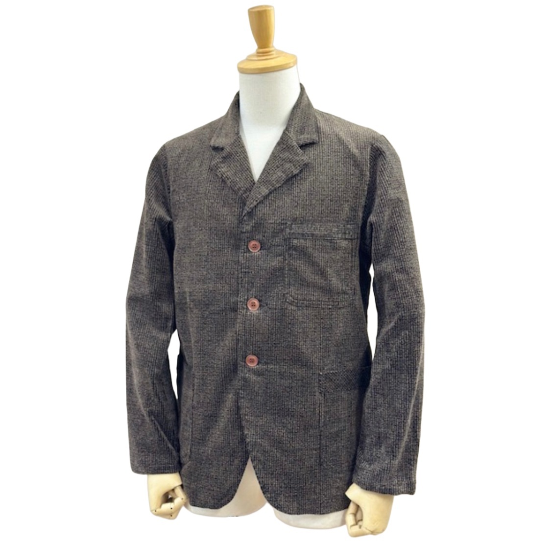小振りな襟やラペル、貼り付けポケットなどが特徴的で古き良き時代のディテールを取り入れたジャケットに仕上げました。