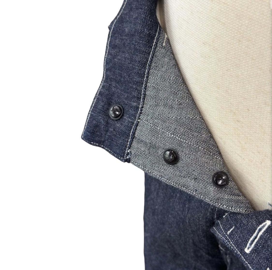 ボタン:黒ラッカーを施した鉄製ドーナツボタン(ベースはアンティークゴールド色)をオリジナルで製作。