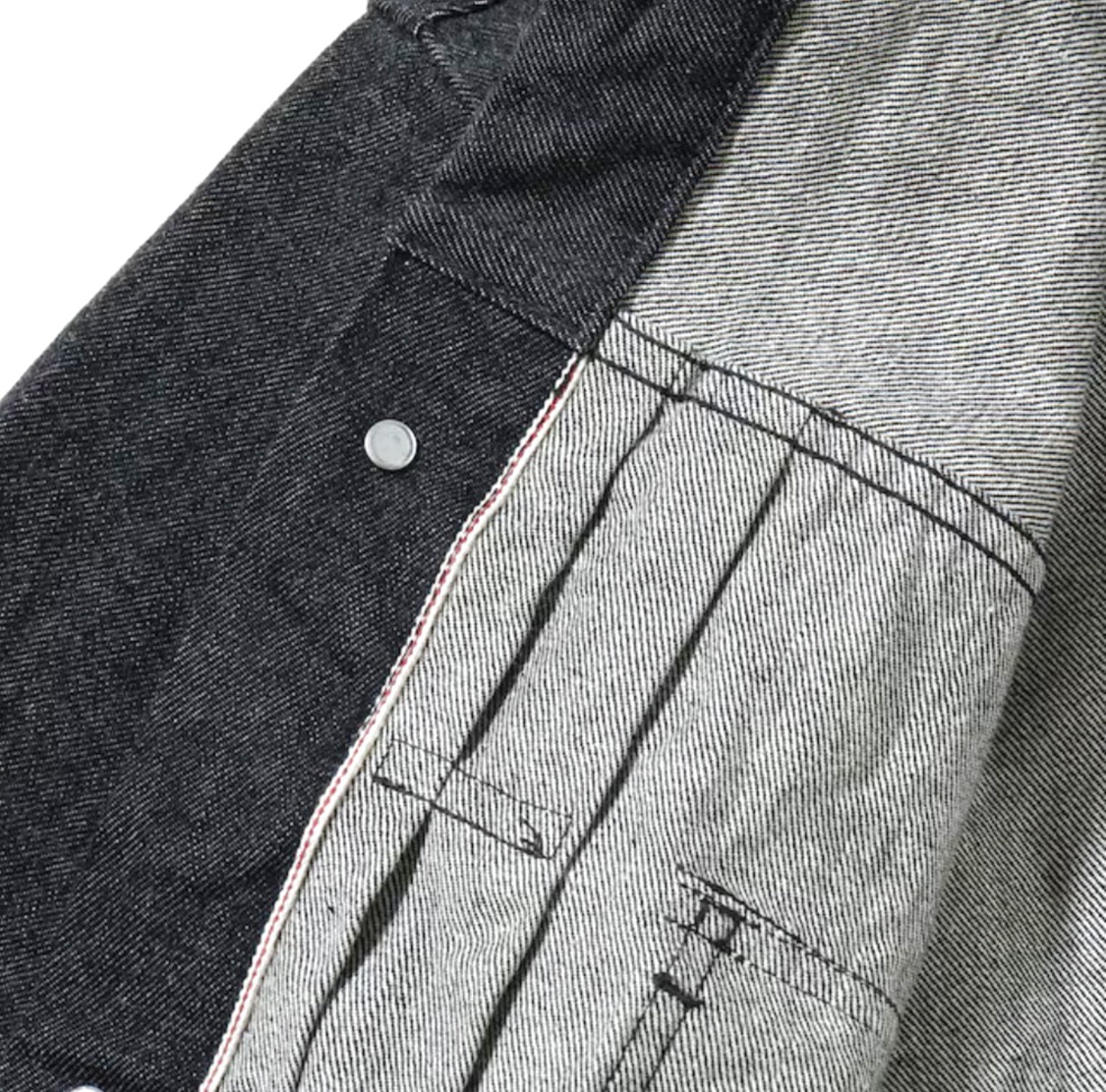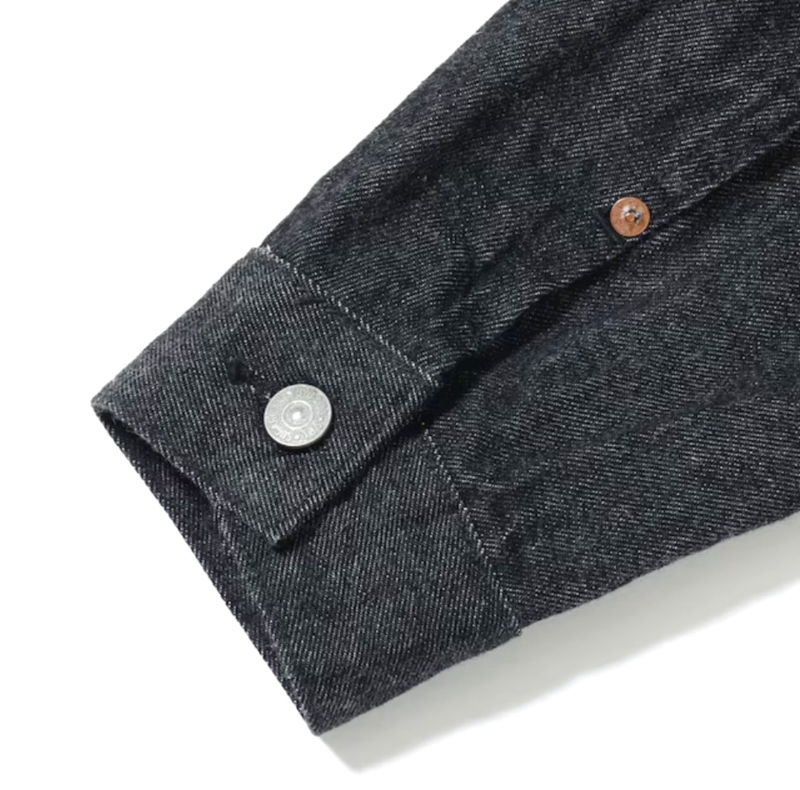 デニムジャケットが労働着からカジュアルウエアとなる過渡期の1953年モデル。通称、2nd(セカンド)。1950年代を代表するその名作を経糸に黒糸、緯糸に生成りの糸を使用したオリジナルのブラックデニムで仕立てた。タテ糸7番、ヨコ糸6番のムラ糸で織り上げた14.25オンスのセルビッジデニムであり、ミミは白×赤となっている。またブラックの染色には硫化染料を使用しており、着用による経年変化で深みのある色落ちを魅せる。同じブラックデニムを使用したジーンズ「Lot No. SC42460」とセットアップで着用可能。