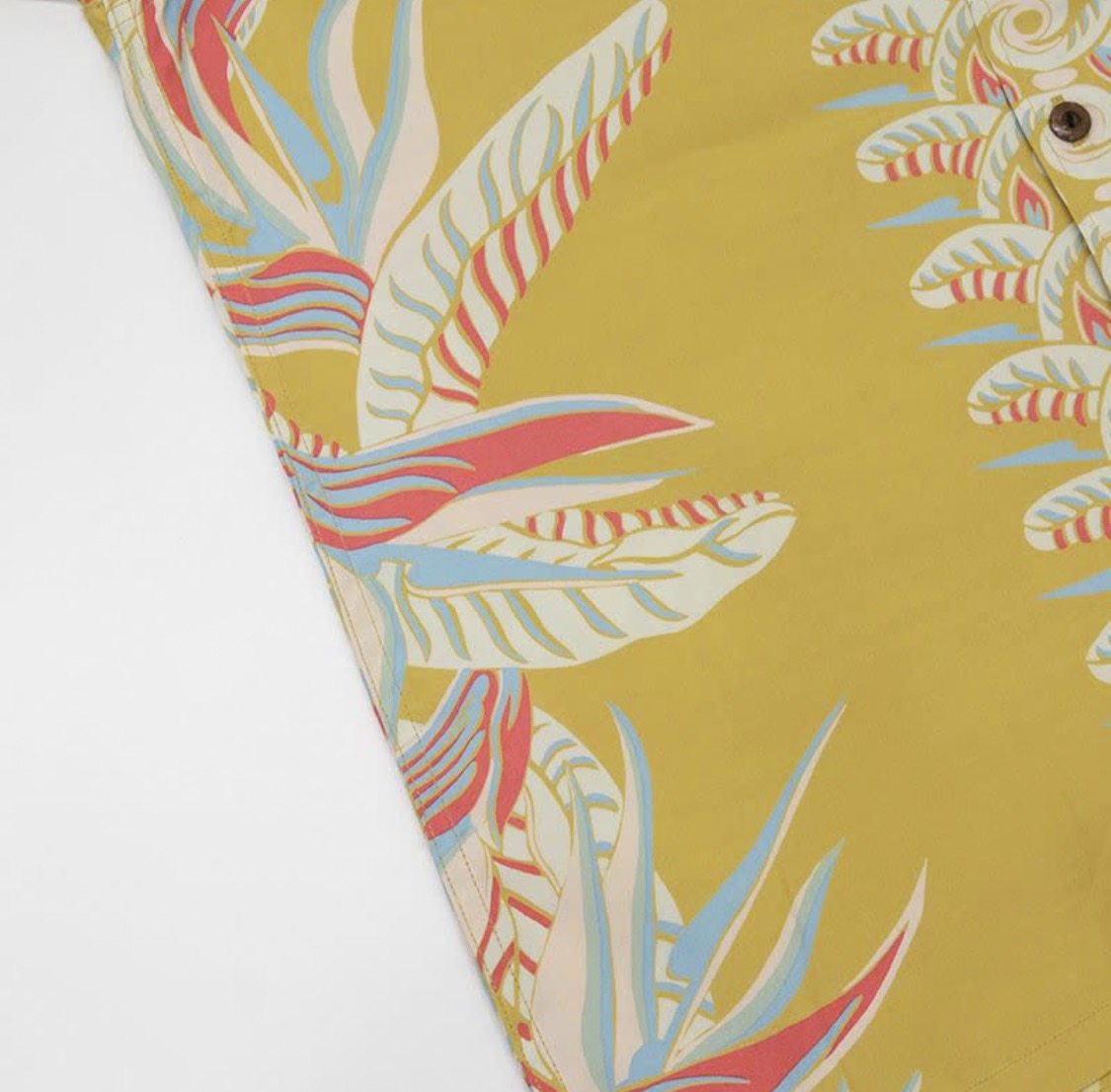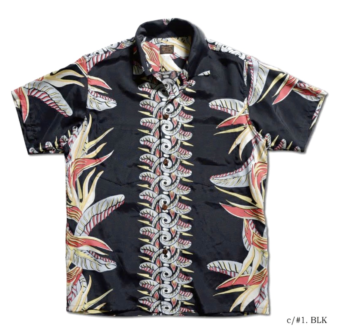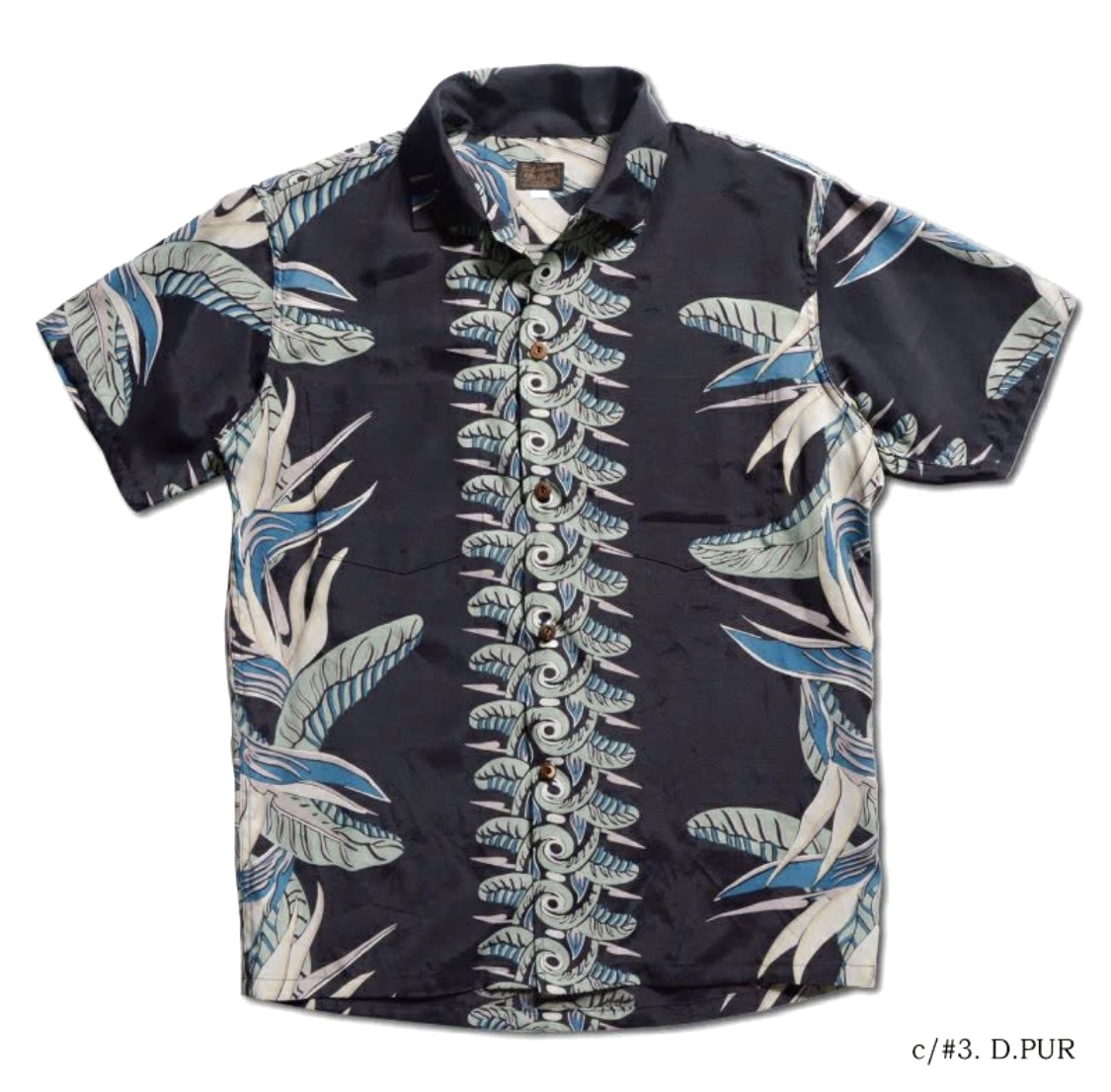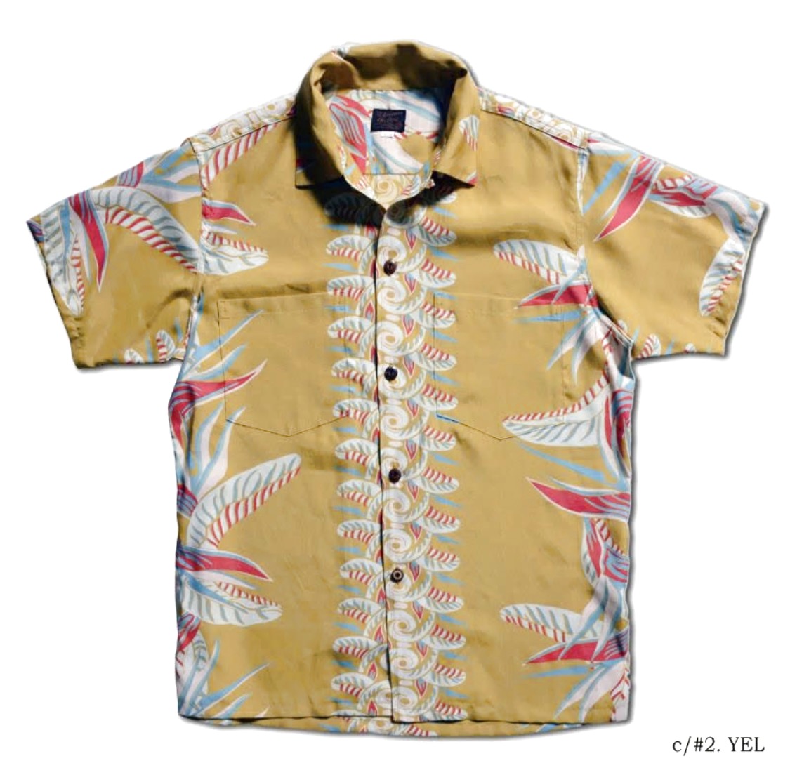 福井県福井市で製造したレーヨン素材に京都府京都市で地染め着色抜染を施行し仕上げた本物工程で創るハワイアンシャツ企画。経糸フィラメント120d、緯糸レーヨン30番によるフジエットファブリックと地染後に捺染を行う地染抜染が本物の証。