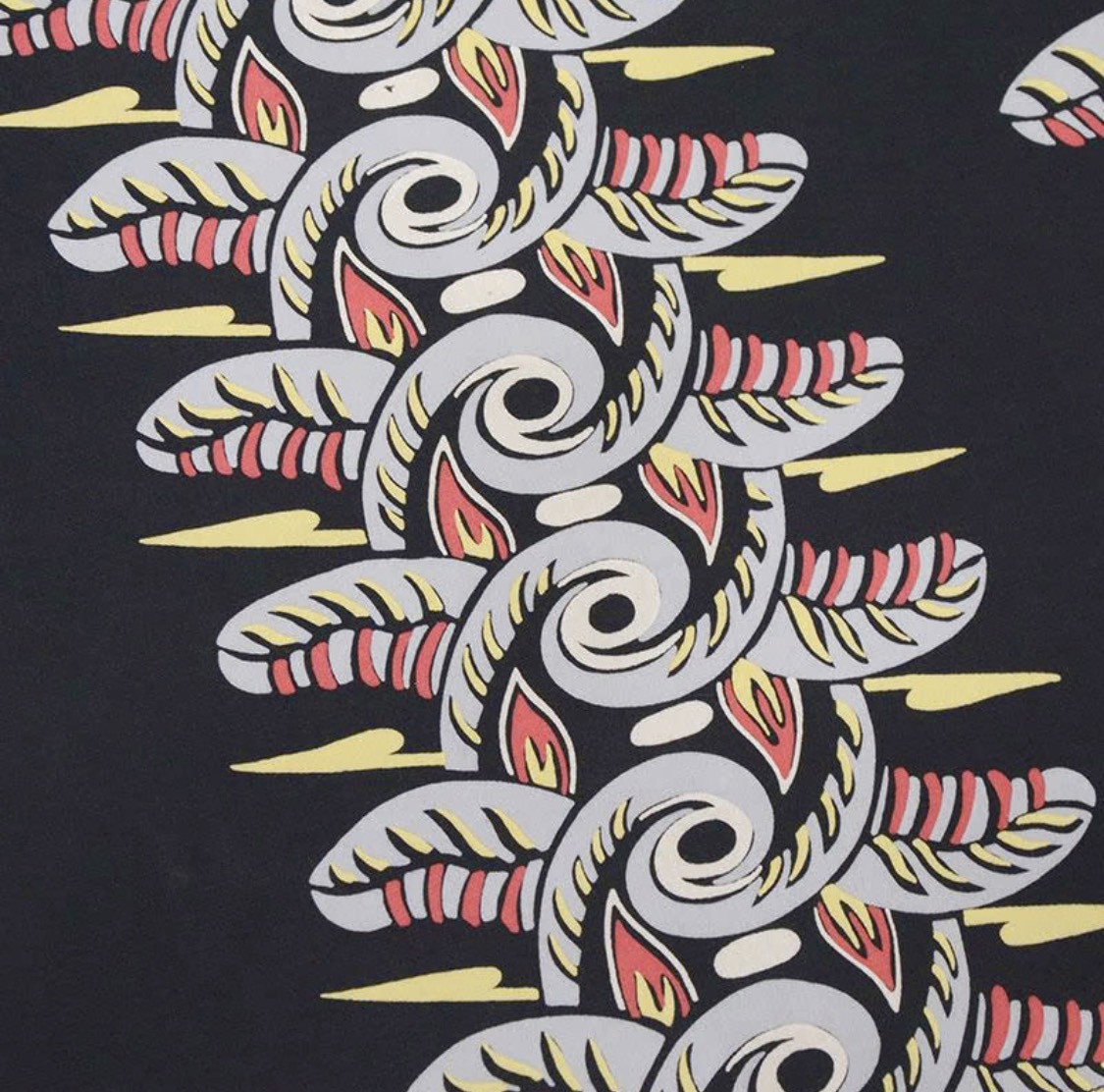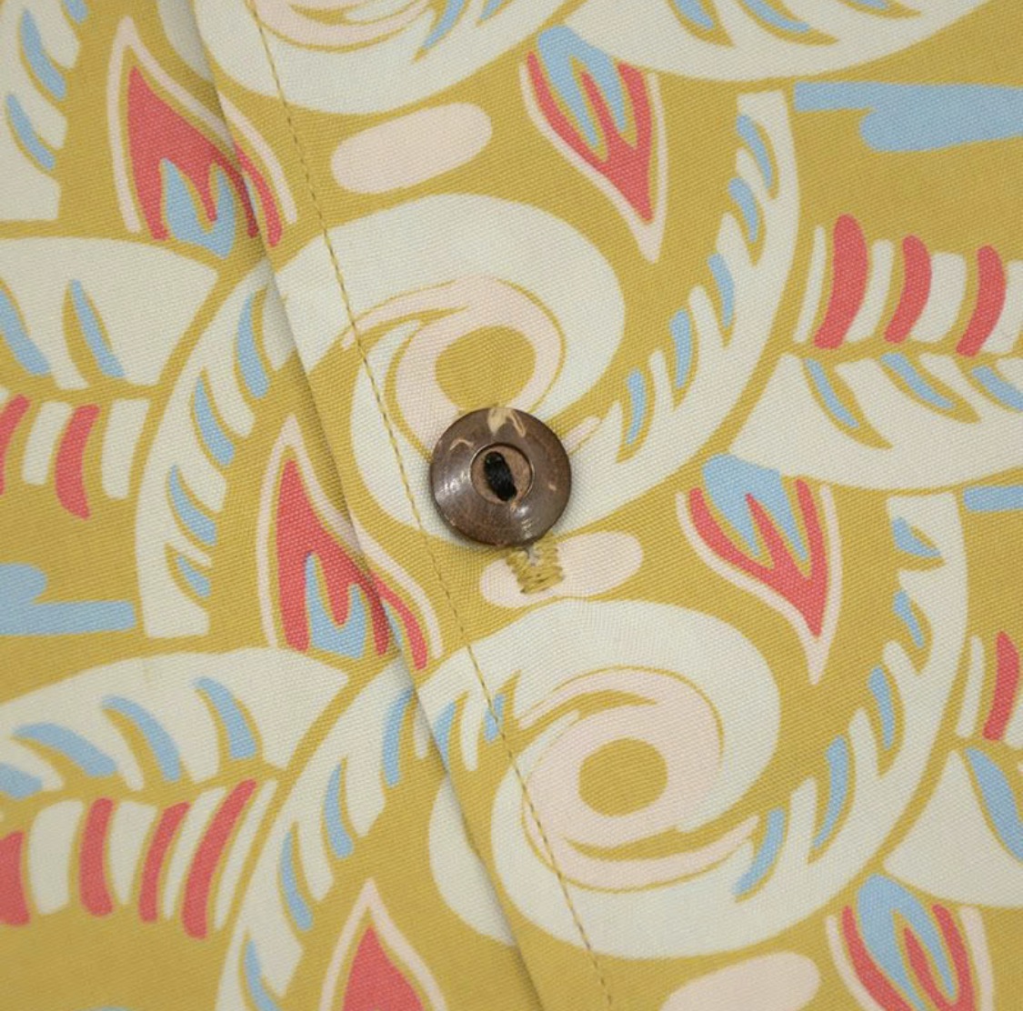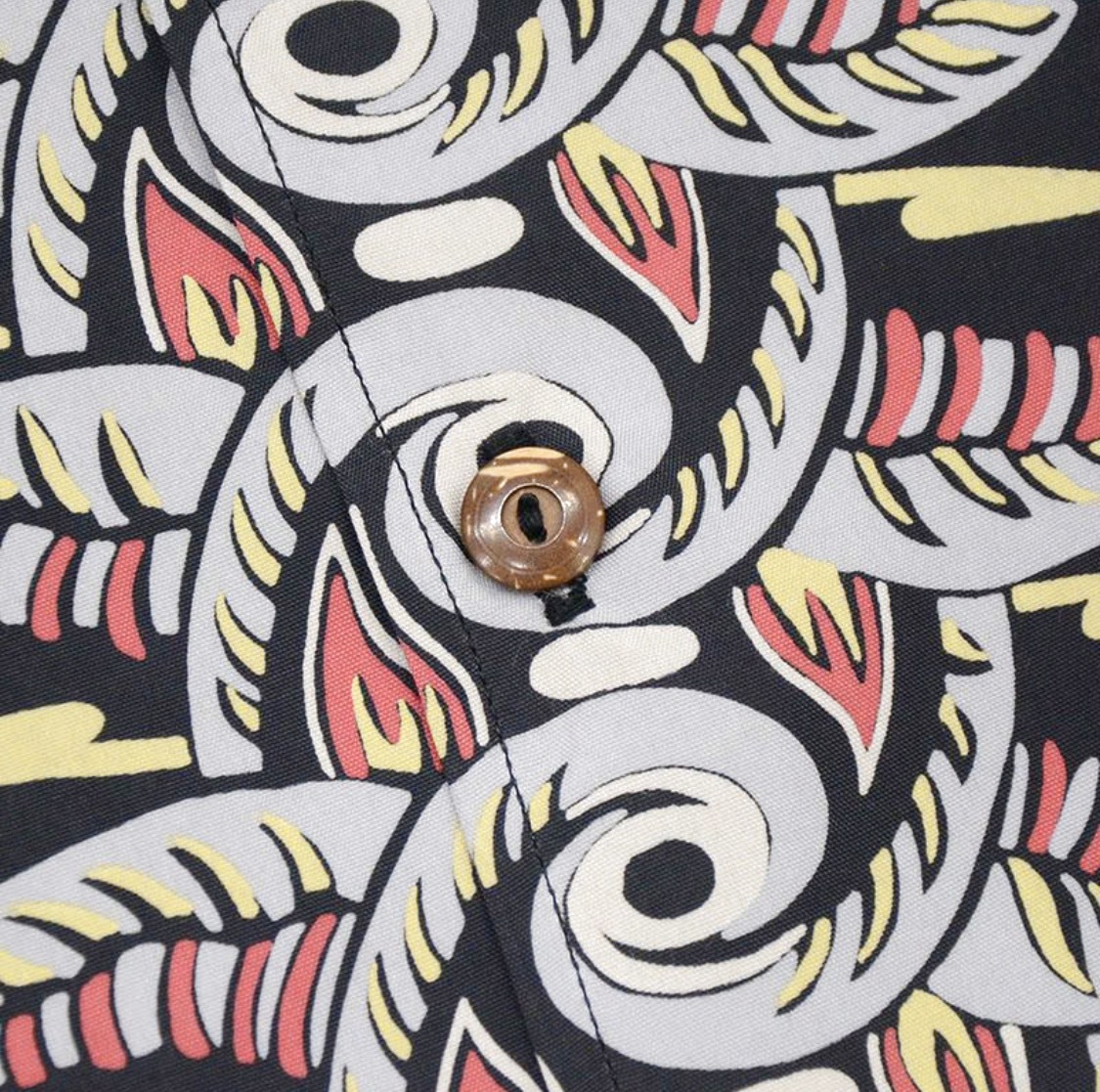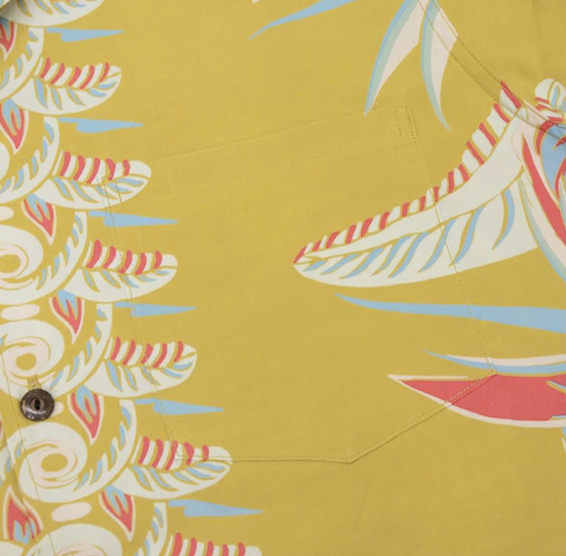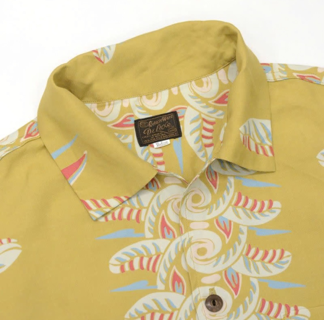 福井県福井市で製造したレーヨン素材に京都府京都市で地染め着色抜染を施行し仕上げた本物工程で創るハワイアンシャツ企画。経糸フィラメント120d、緯糸レーヨン30番によるフジエットファブリックと地染後に捺染を行う地染抜染が本物の証。