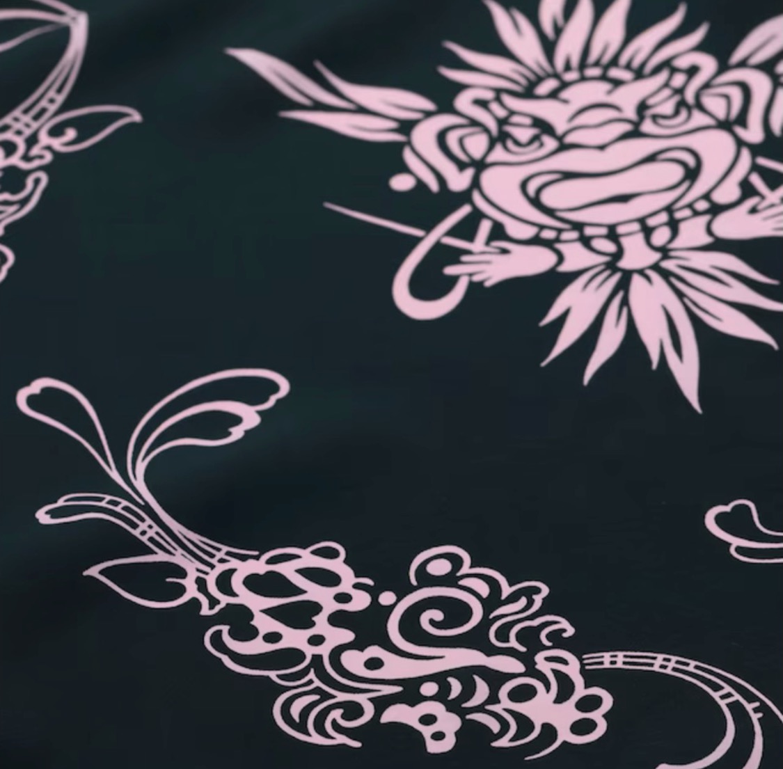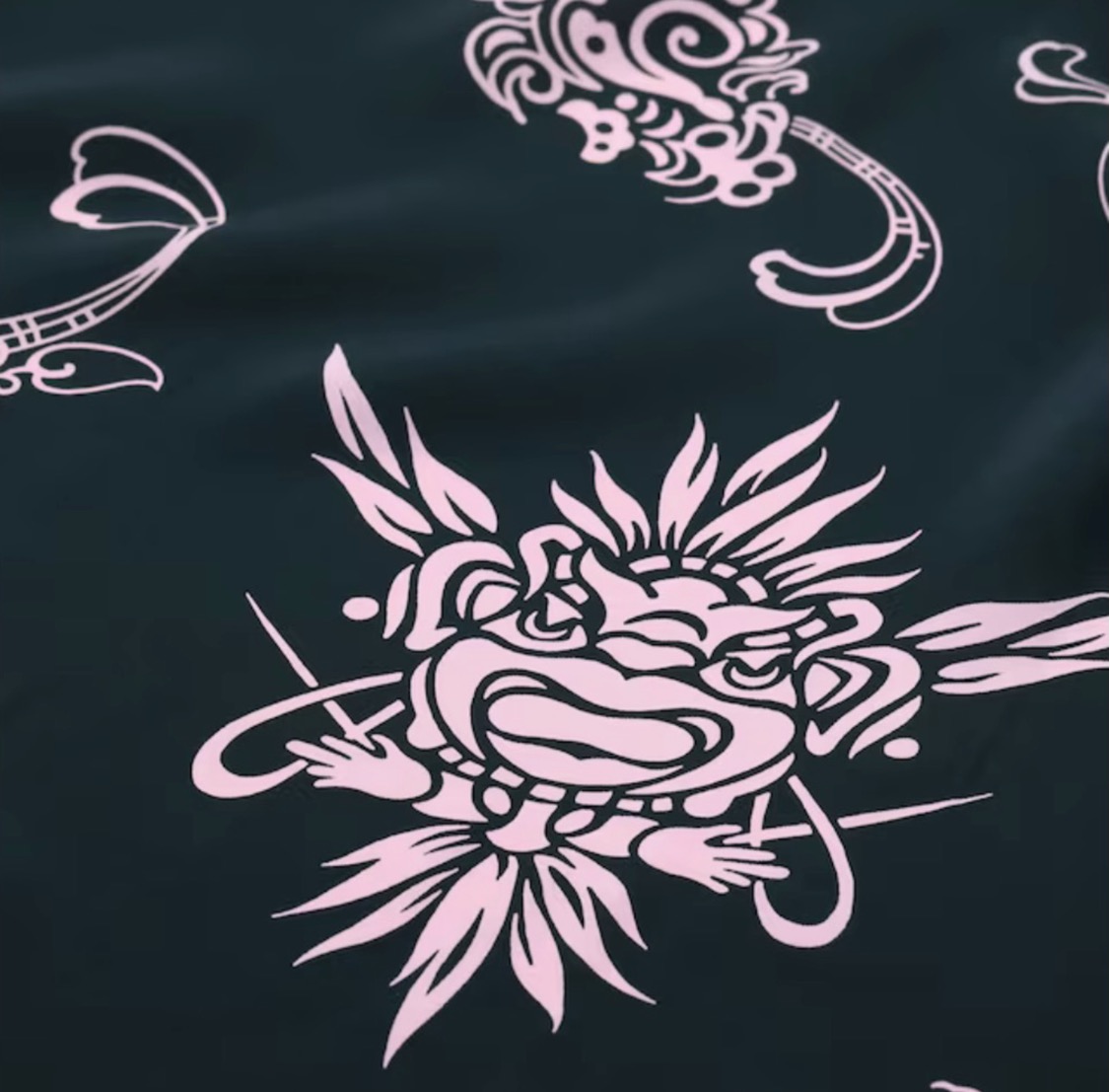 ポリネシアの多くの島で神の化身として崇拝されてきたティキ。自然界に存在するあらゆるものに神が宿るとされてきたハワイにおいてもティキの存在は特別で、アロハシャツのモチーフとして幾度となく登場してきた。その中でもティキをメインモチーフとしたデザインは、ポリネシアンブームが最高潮に達した1960年代以降に多くみられる。ここで紹介する作品は最初期の頃、フィラメント生地に単色で抜染されたデザインで、非常に希少価値が高い。