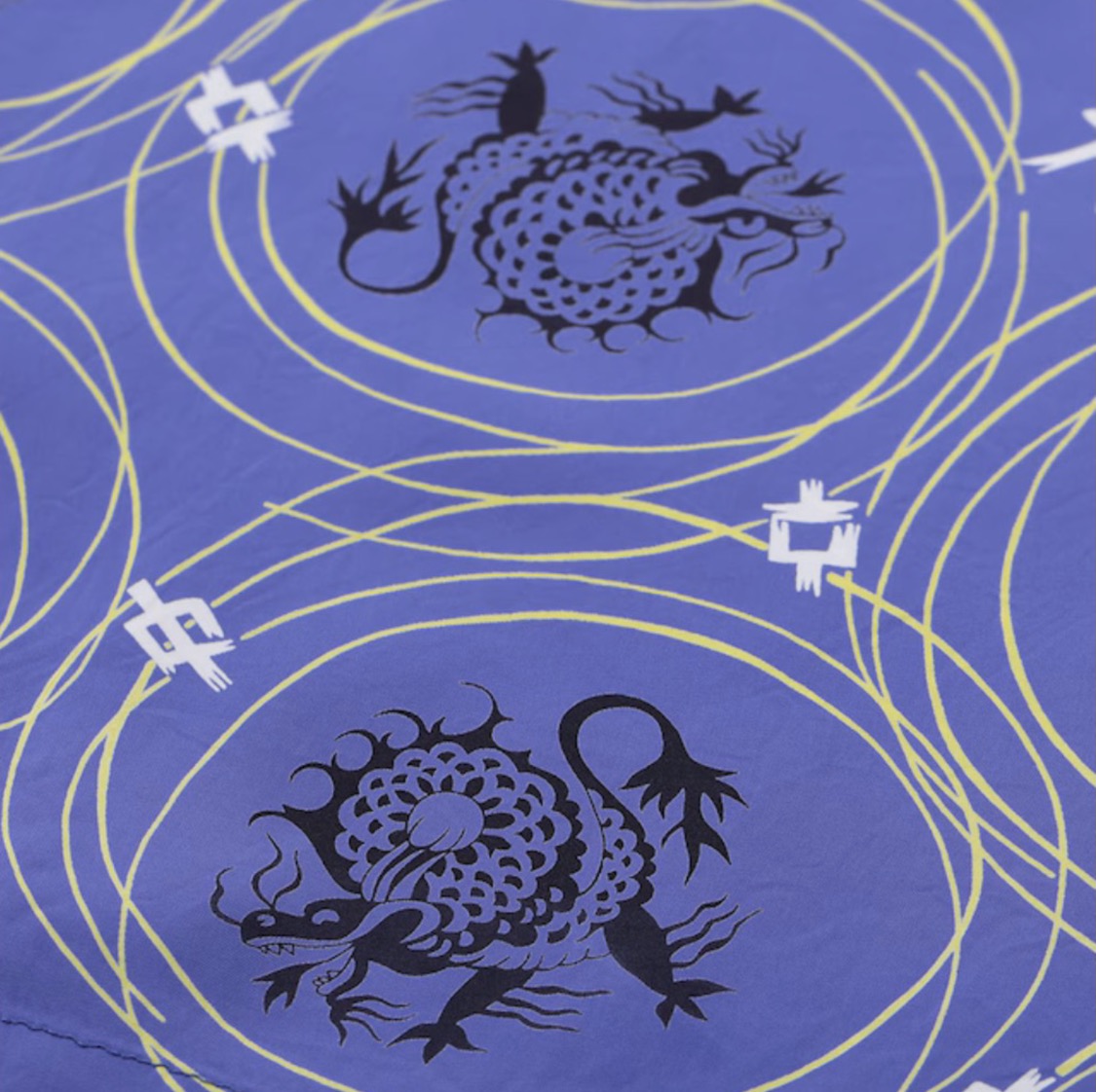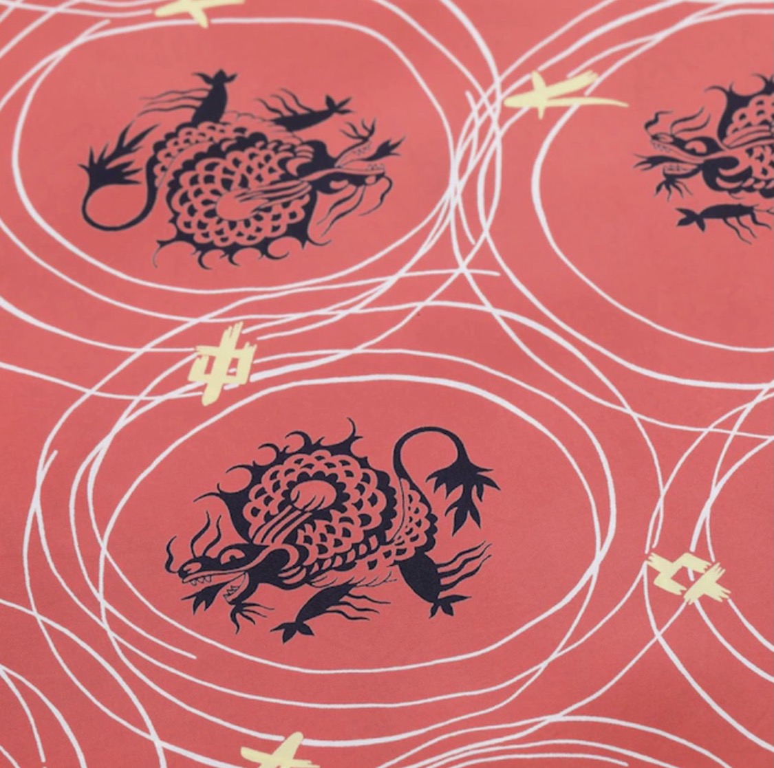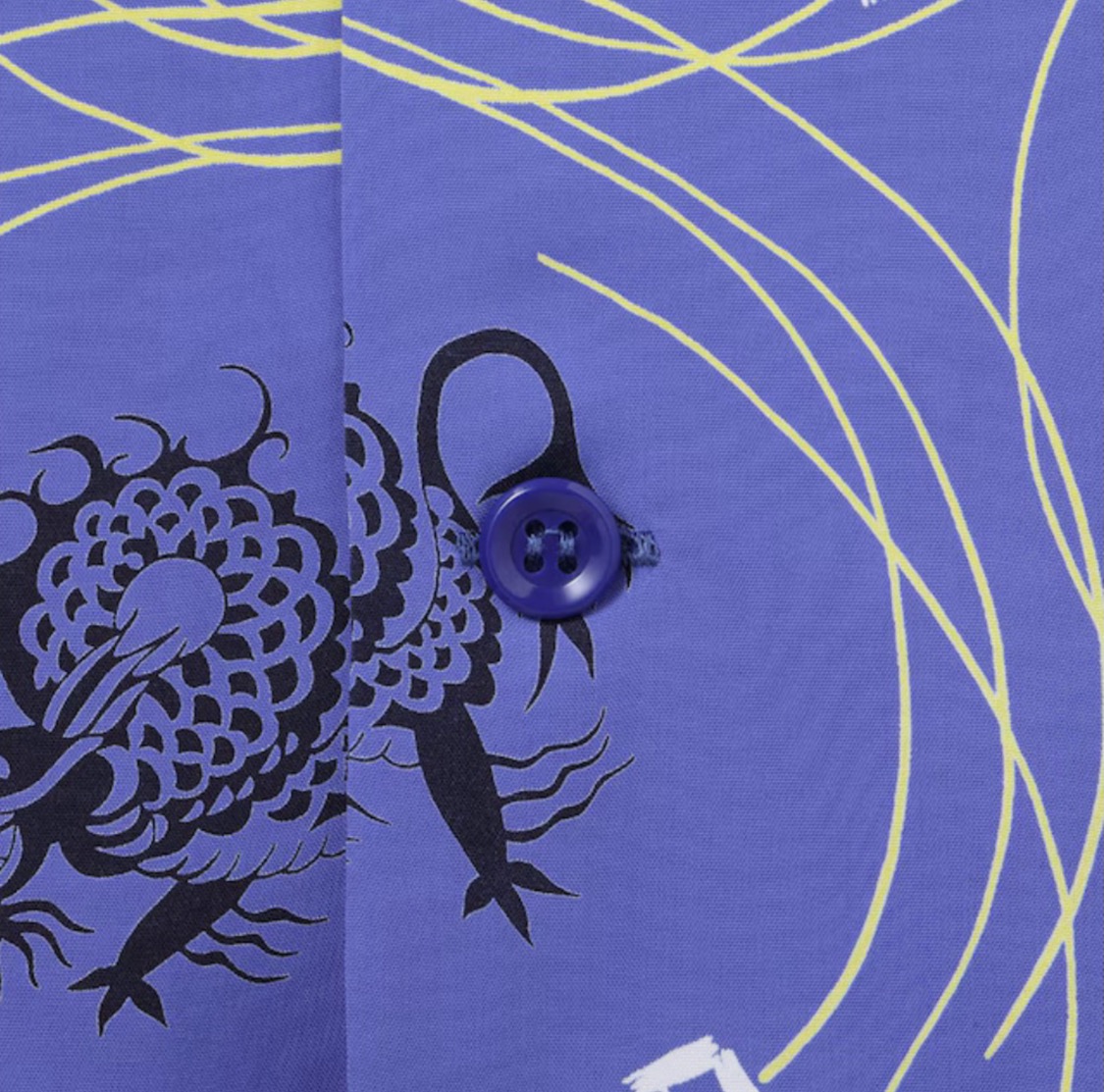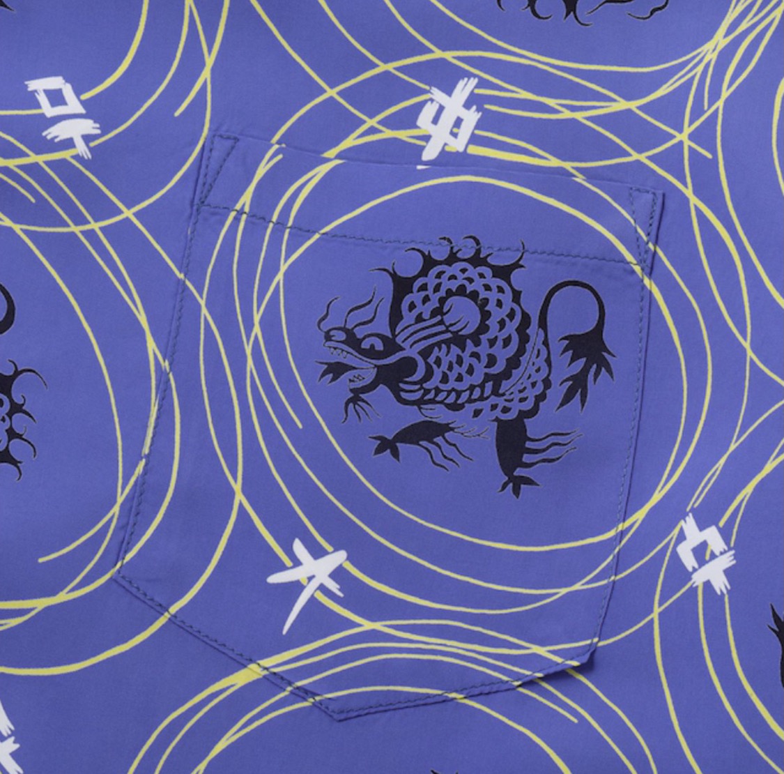 アメリカ東海岸を拠点とし、アメリカ本土の多くのブランドにアロハシャツの生地を提供していた大手生地メーカー、コーン・ホール・マークス。この作品は、同社が販売用のブランドとして展開していた「メイド・イン・カリフォリニア」のネームで手掛けたもの。コミカルな表情のドラゴンをメインモチーフとし、幾何学的な要素と組み合わせ、1950年代当時としても前衛的であったデザインを抜染で表現した特徴的な一枚。